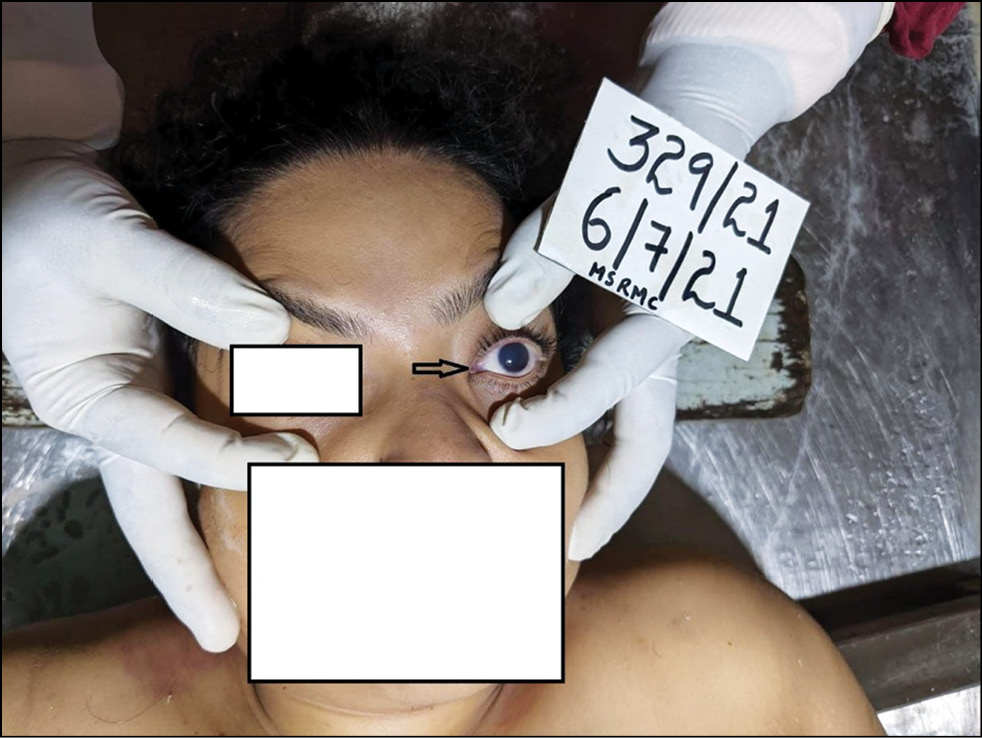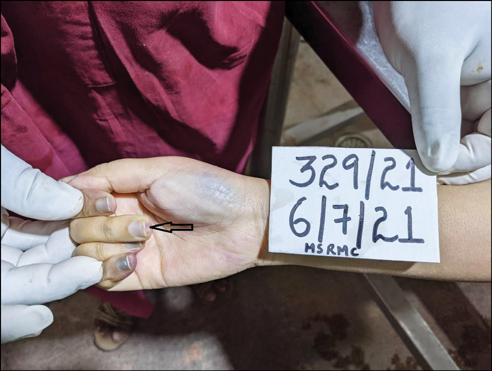 On examination, she was moderately built and nourished. Eyes were closed, and pupils were dilated and fixed. Conjunctival congestion (Figure 1) and marked cyanosis of nail beds (Figure 2) were noted. White fine froth was present over both nostrils (Figure 3). Postmortem staining was noted over the back and fixed. Rigor mortis was appreciated all over. An intramuscular injection mark was present over the outer aspect of her left arm over the deltoid region (Figure 4). The cut section revealed no abnormality. No external injuries on the body were noted.