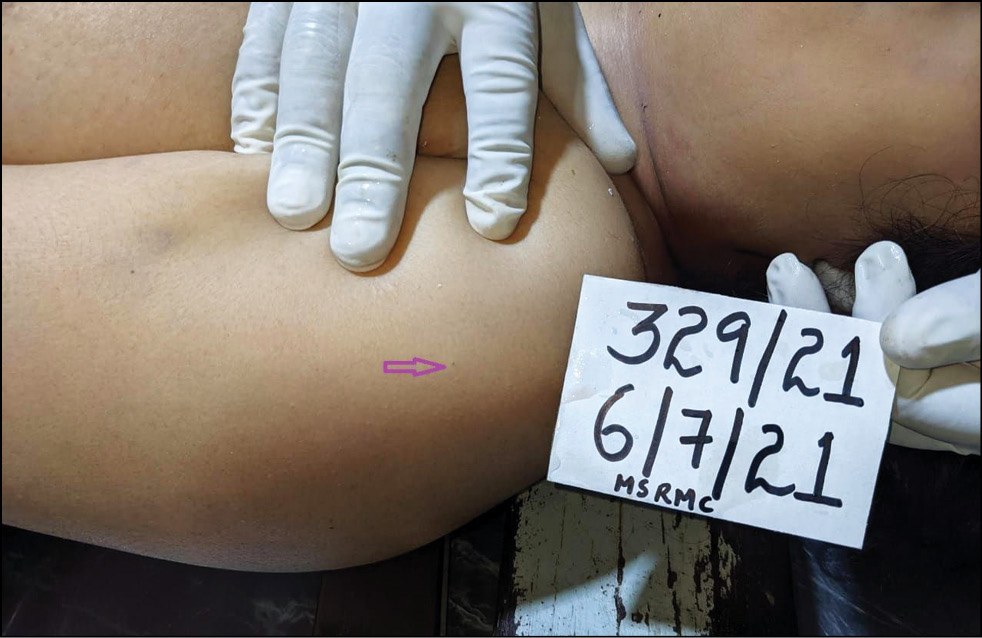 Fig. 4. Intra muscular injection mark present over the outer aspect of left arm.