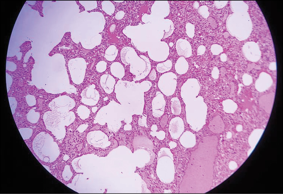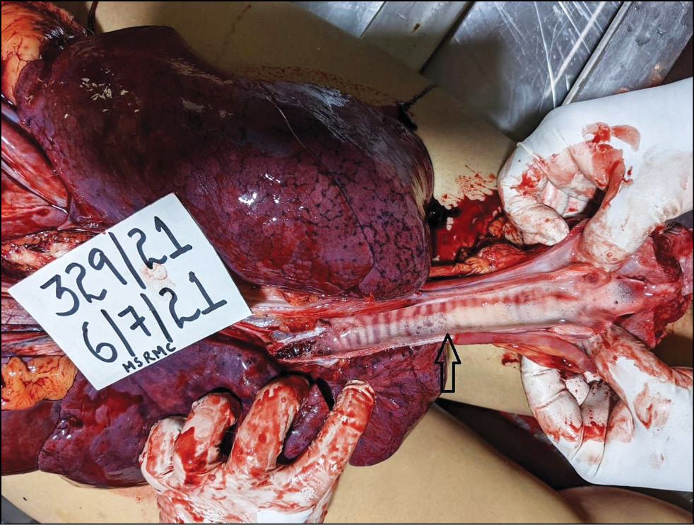 Lungs were congested and edematous, and the cut section exuded blood mixed with froth. Tracheal dissection showed copious amounts of froth and mucus but no signs of aspiration (Figure 5). The heart was intact and weighed 239 g. The coronary arteries were patent. The liver, kidneys, and spleen were intact and congested. The stomach was empty, congested with mucosa, and grossly hemorrhagic. A faint, fruity smell of alcohol was present. The uterus was normal in size, and its cavity was empty. The scalp and skull were intact. On opening the skull, the meninges were intact and congested. Sulci and gyri were flattened, and the brain was edematous. The cut section of the brain showed numerous petechial hemorrhages in the white matter.