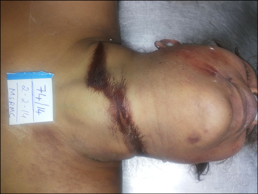 Hanging was successful in 34 cases (73.9%) where the body was suspended completely. Height fallen was measured as the distance from the platform to the feet. The height was 0.5–1 m in 28 cases (60.9%) and <0.5 m in 16 (34.8%). A single ligature mark was found in all patients, was present above the thyroid cartilage in 38 (82.6 %), and was oblique in 40 (87%). The ligature marks were broad and narrow in 34 (73.9%) and 12 (26.1%) patients, respectively. It corresponded to the material used. Rope was used in 12 cases, causing a narrow ligature mark, and cloth materials like saree, veil, bedsheets, and curtains were used as ligature materials in 34 cases, which caused broader ligature marks. The mark was interrupted in 38 (82.6%) patients (Fig. 1) and was continuous in the remaining. In 18 of them (39.1%), the mark was prominently visible (Fig. 2), whereas it was faint in 28 (60.9%) cases (Fig. 3). Nail scratch abrasions were found in two cases. A knot was found in the occipital region in 24 (52.1%) cases, and the right side of the neck was the second common site of knot in 18 (39.1%). The knot was fixed in 28 (60.9%) cases, and a slip knot was noted in 18 (39.1%).