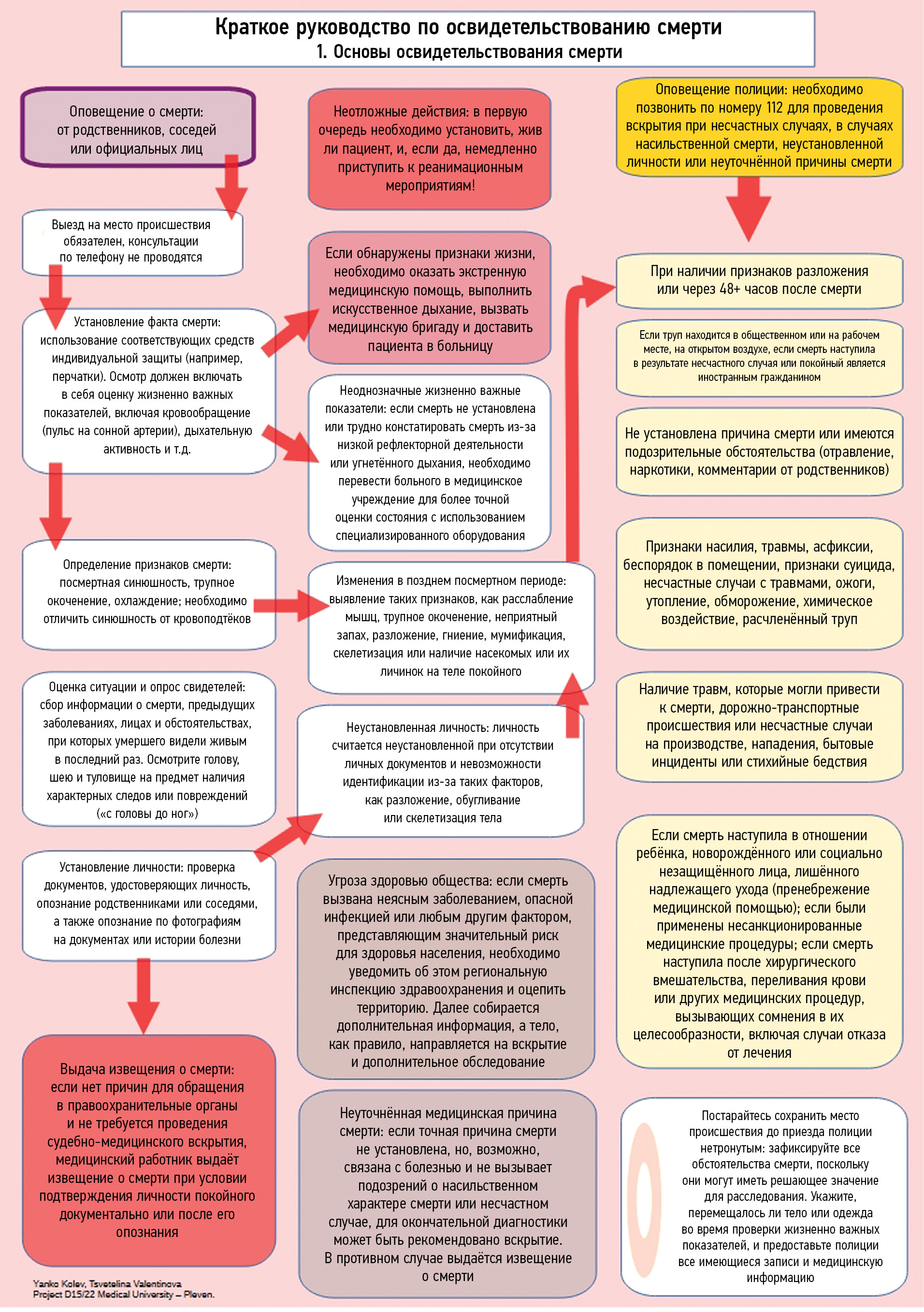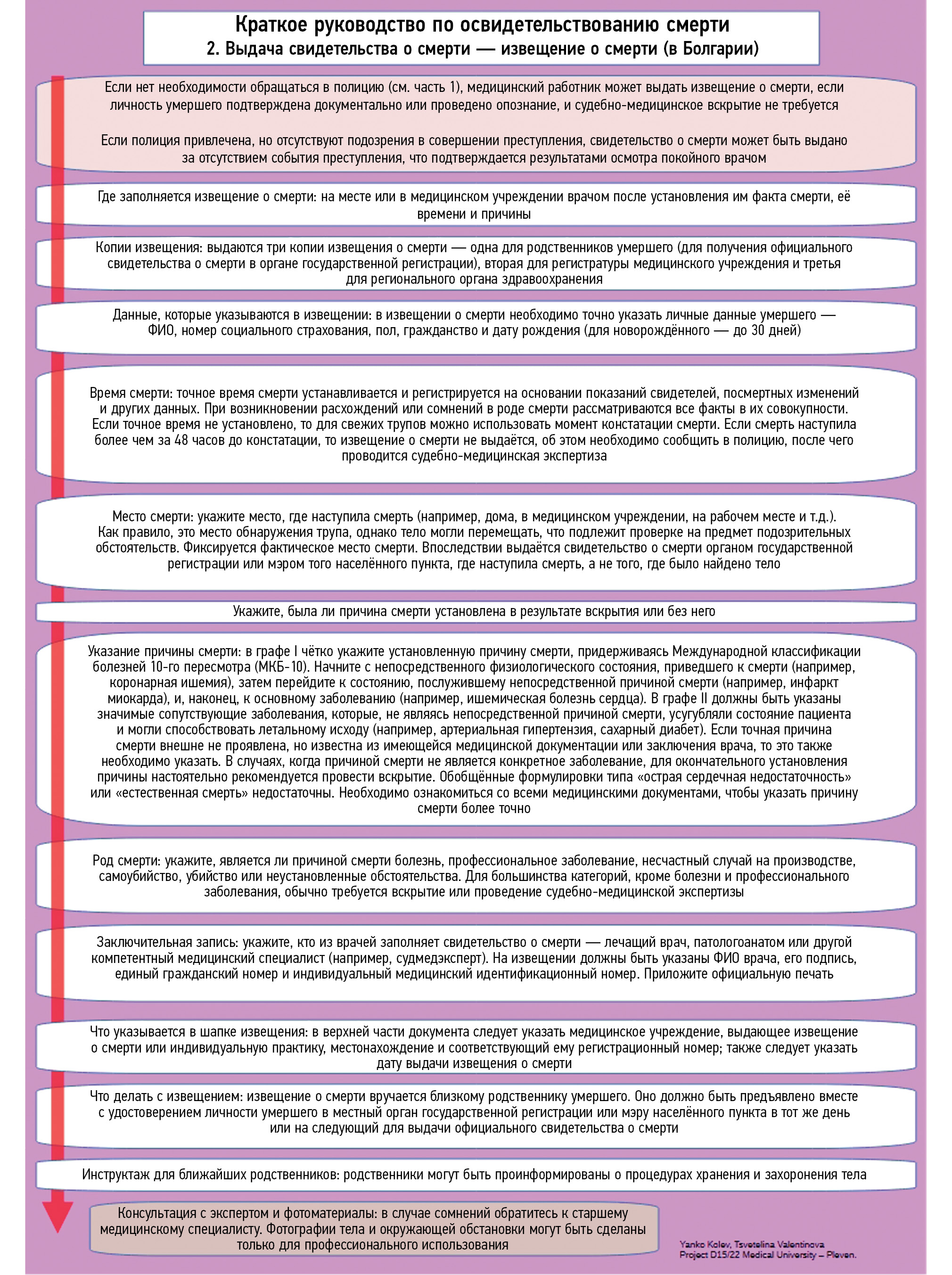 BACKGROUND: In Bulgaria, procedural protocols following a citizen’s death are governed by an intricate network of normative documents. Despite the presumed alignment between international and national guidelines, practical experiences reveal shortcomings in the proficiency of healthcare providers, particularly in cases involving prior medical interventions or systemic vulnerabilities.
