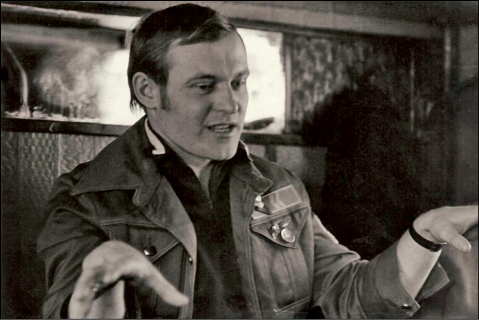 Студент 5-го курса лечебного факультета, заместитель секретаря комитета ВЛКСМ АГМИ, комиссар вузовского и зонального отрядов Владимир Клевно в вагоне поезда Барнаул — Камень-на-Оби. 1977 г.