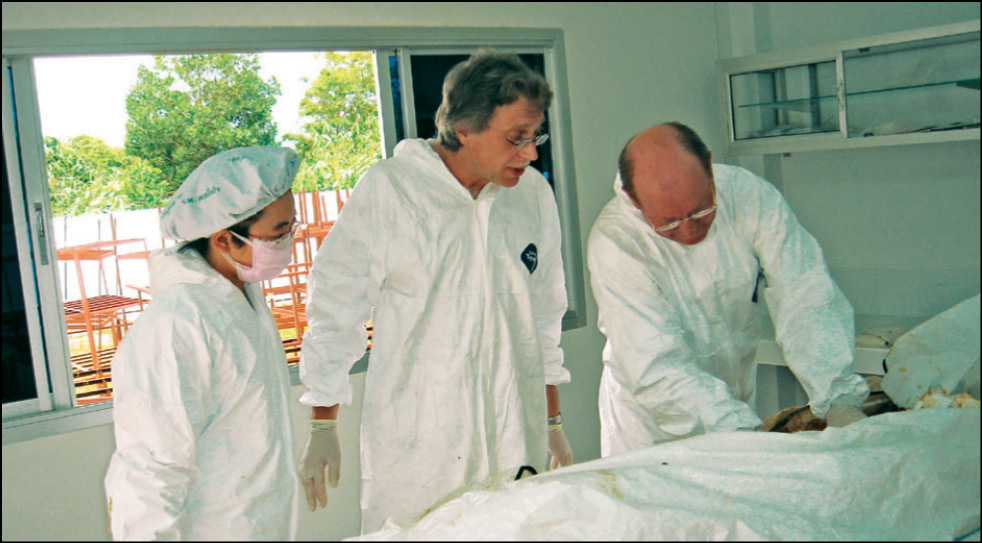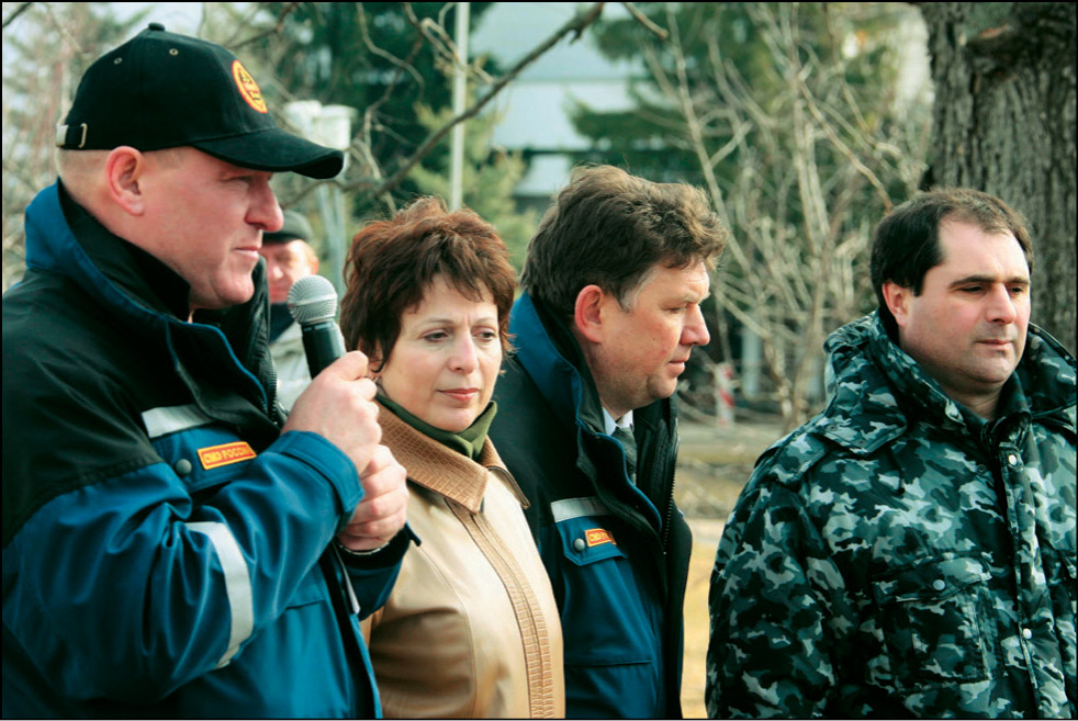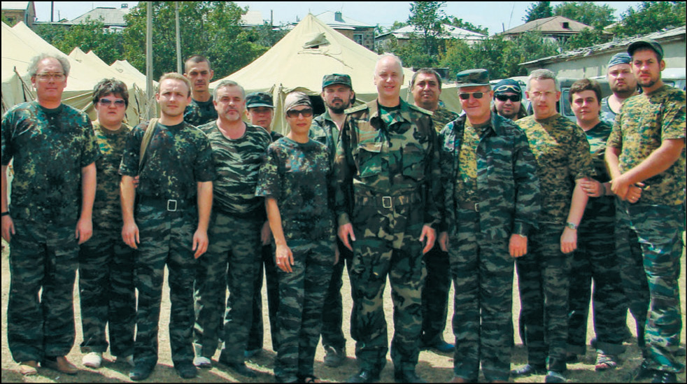 Бригада быстрого реагирования БСМЭ Ростовской области во главе с заместителем начальника А.Е. Пановым (крайний слева). В центре — первый заместитель Генерального прокурора Российской Федерации — руководитель Следственного комитета при прокуратуре Российской Федерации А.И. Бастрыкин и руководитель рабочей группы Минздравсоцразвития России, Главный судебно-медицинский эксперт Минздравсоцразвития России, директор Российского центра судебно-медицинской экспертизы В.А. Клевно. Цхинвал, Южная Осетия, 2008 г.