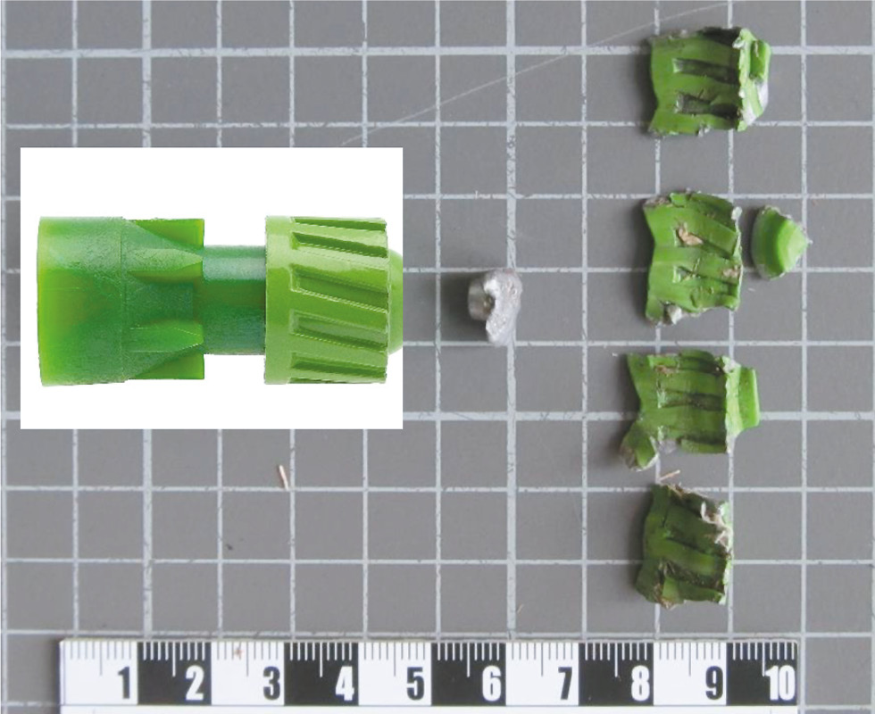 The bullets of the specified cartridges were almost completely identical from the design point of view. They were of a full bore, lead, turbine type, 1.8 cm in diameter at the base, 1.8 cm in height, weighing 35±0.1 g, and having a green polymer paint coating on the outside. Into the rear part of the bullets, green polymer shanks were integrated, which could not be separated manually. The visible part of the shank was cylindrical with six wedge-shaped notches in the upper part. The shank diameter at the base was 1.8 cm, and the height of the visible part was 1.8 cm. The fore part of the expanding bullet had a hemispherical depression with a diameter of 0.5 cm and a depth of 0.4±0.1 cm, ensuring its fragmentation into at least five fragments upon hitting the target. The fore part of the bullet without expanding properties had a hemispherical protrusion with a basal diameter of 1 cm and a height of 0.5 cm (Fig. 1).