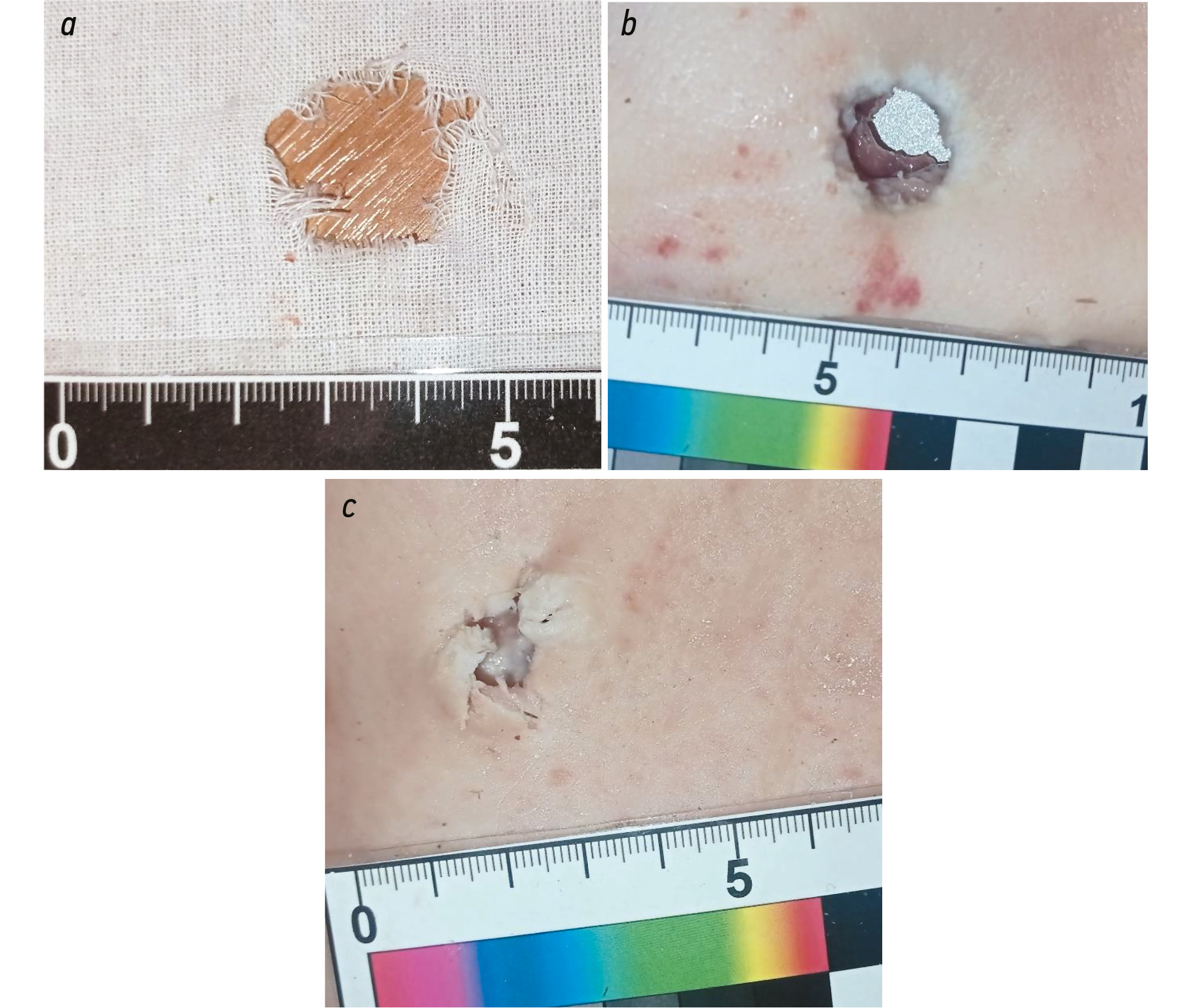 Fig. 2. Experimental gunshot damage after firing UNO 35 cartridge: a ― on cotton fabric; b ― an entrance gunshot hole at biological simulator skin; c ― an exit gunshot hole at biological simulator skin.