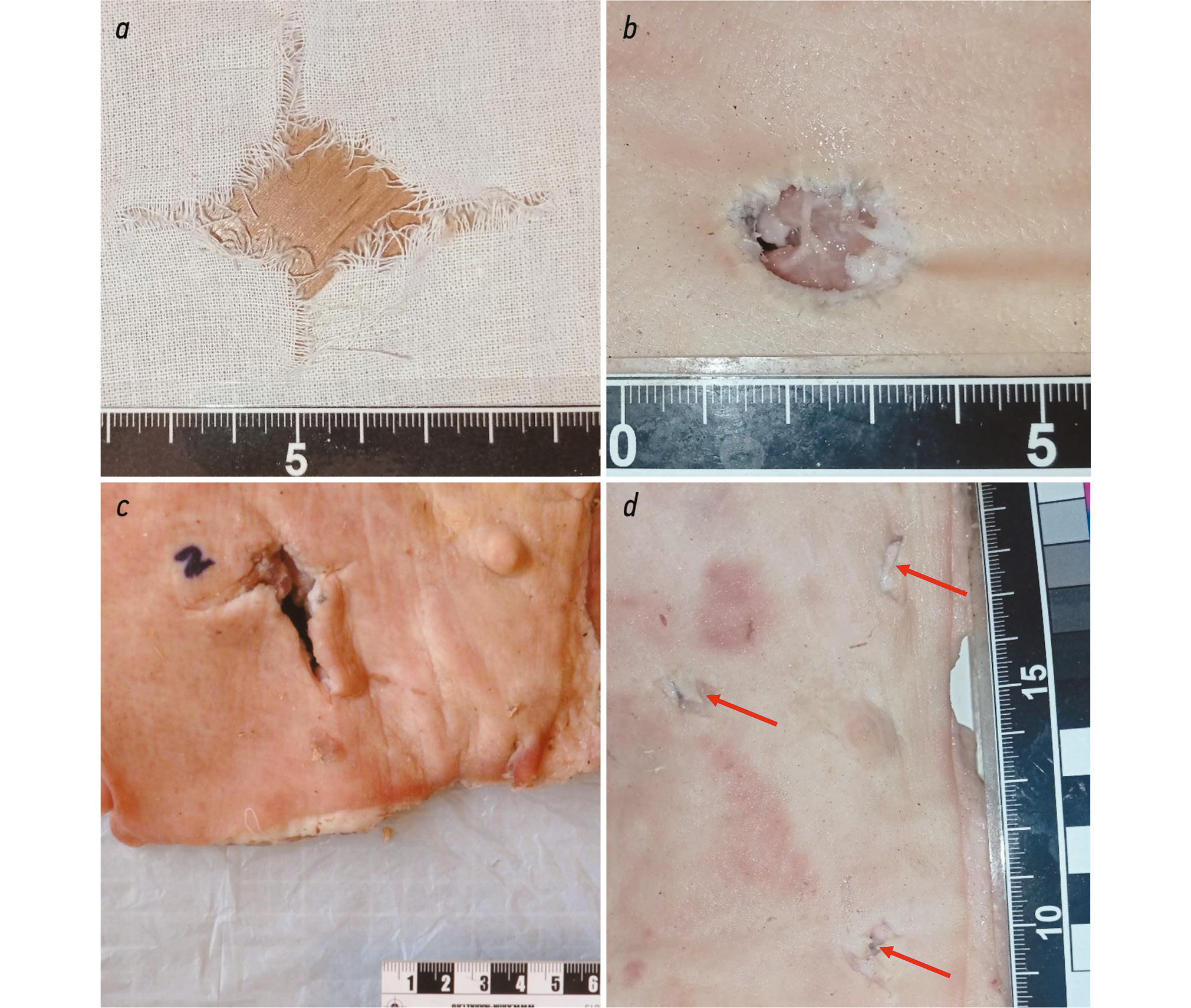 Fig. 3. Experimental gunshot damage after firing UNO 35E cartridge: a ― on cotton fabric; b ― an entrance gunshot hole without pronounced radial tears at biological simulator skin; c ― an entrance gunshot hole with pronounced radial tears at biological simulator skin; d ― exit gunshot holes at biological simulator skin (marked with red arrows).