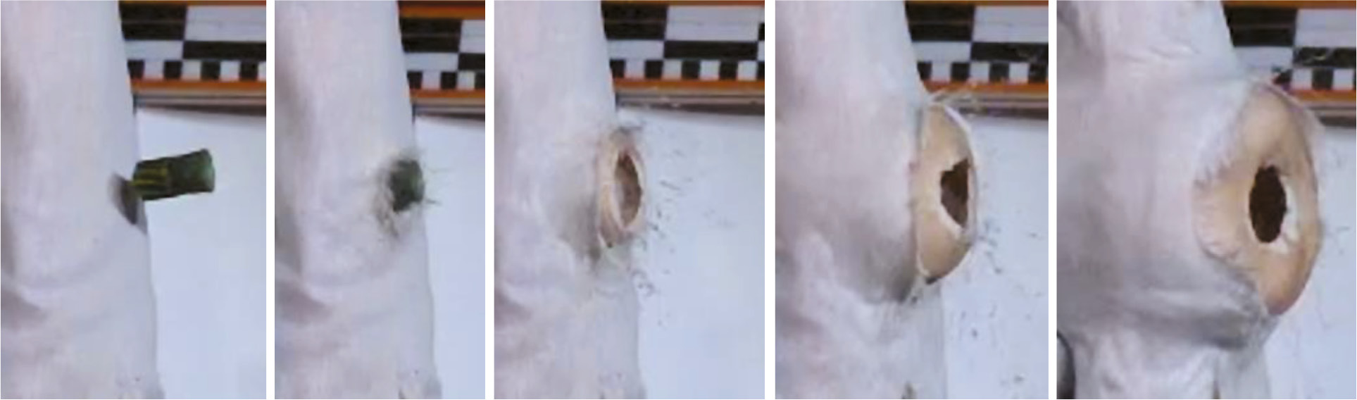 The main differences in the morphological characteristics of the gunshot wounds were determined based on the terminal ballistics of the bullets. Due to the presence of a recess in the head part, the UNO 35E bullet was destroyed upon hitting the biological simulator and its fragments penetrated the tissues as independent missiles, forming several exit wounds. The non-expanding bullet UNO 35 was unfragmented, but only deformed in the head part, forming classical gunshot damage with a rectilinear, tapered expanding channel along the bullet movement and one exit hole. The destruction of UNO 35E transfers a greater part of the kinetic energy in comparison with UNO 35, as indicated by variations in the morphological characteristics of the exit damage. The UNO 35 bullet exits the target with kinetic energy sufficient to achieve penetrating action (minus-tissue defect in 100% of the exit wounds), compared to 50% with the UNO 35E bullet, including blunt-through damage. The high-speed video revealed that (Fig. 4), when an expanding bullet hits, an extensive temporary pulsating cavity is formed in the soft tissues, causing marginal radial ruptures both on the clothing and the skin of the biological imitators adjacent to the entry hole, highly similar to the damage caused in the first zone of the close range of the shot (Fig. 4).