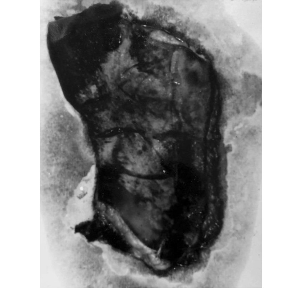Fig. 1. A fragment of putrefactive changed skin, submitted for research.
