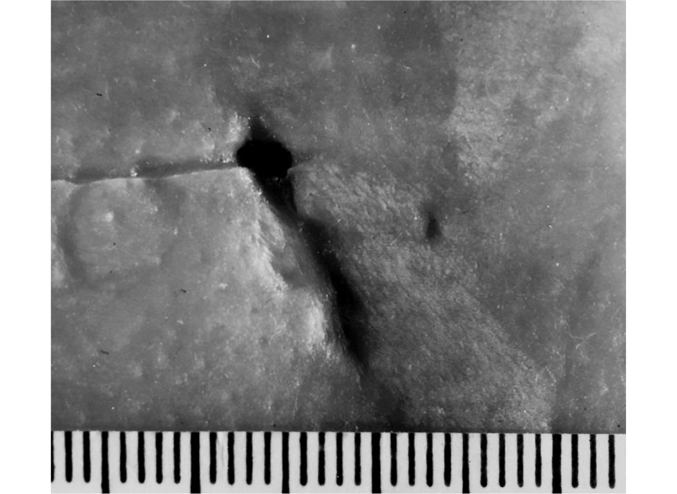 The flap was treated with a vinegar–alcohol solution to reveal the features of the altered area on the skin. Following this, the skin exhibited discoloration, flattening, and swelling, thereby enhancing the visualization of the features of the altered area. The scar, which was in the form of a westernized area, measured 15 mm in length, 2–3 mm in width, and 1–2 mm in depth and resembled a trough. The edges had a rounded, sinuous morphology and converged at sharp angles at the ends. The bottom of the western area comprised dense connective tissue with whitish-brown color, an uneven texture, and fine granularity (Fig. 2).
