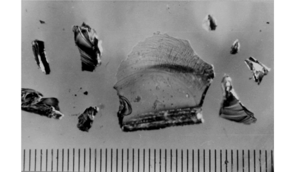 Fig. 3. Type of microfragments of glass, found in scar tissue (division value 0.1 mm).