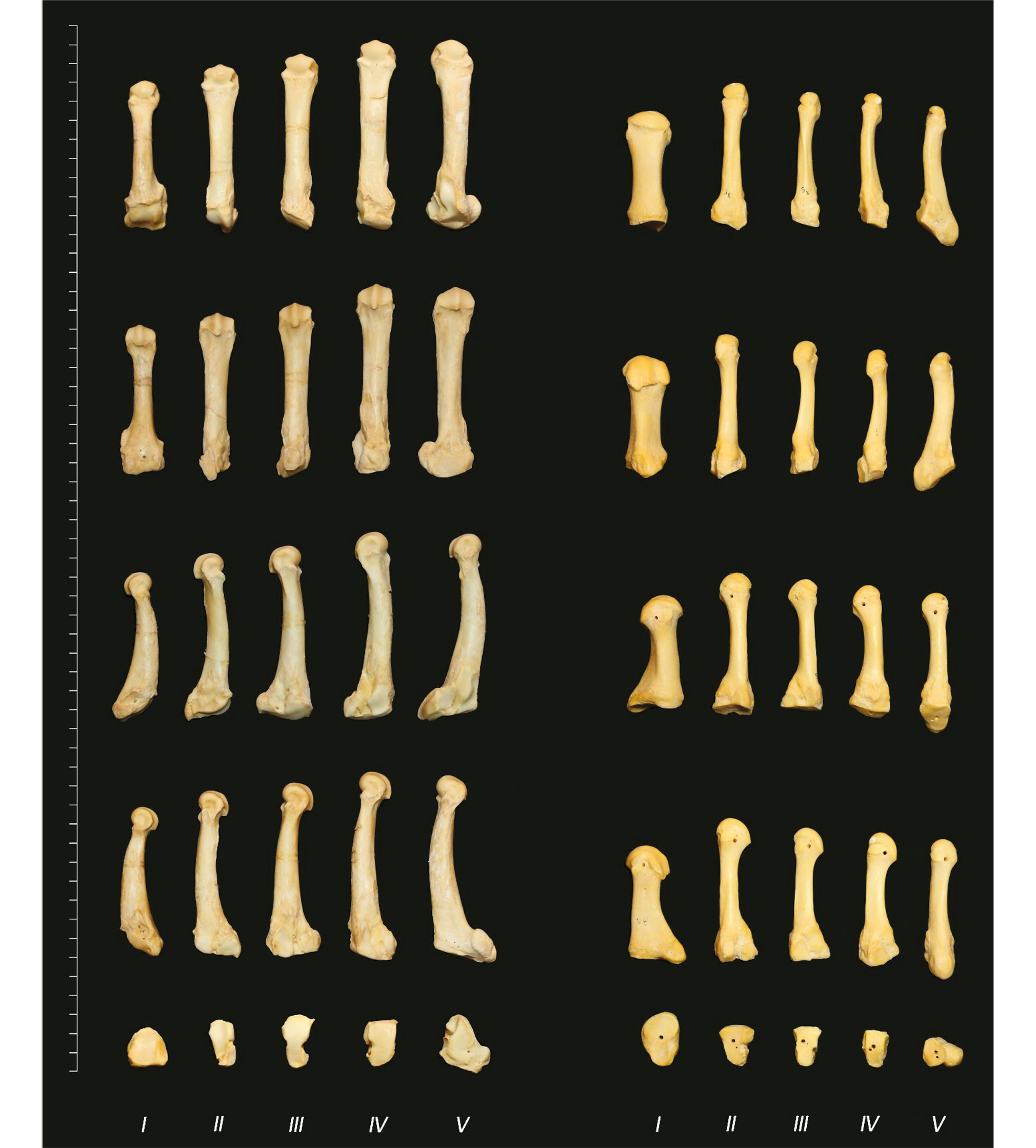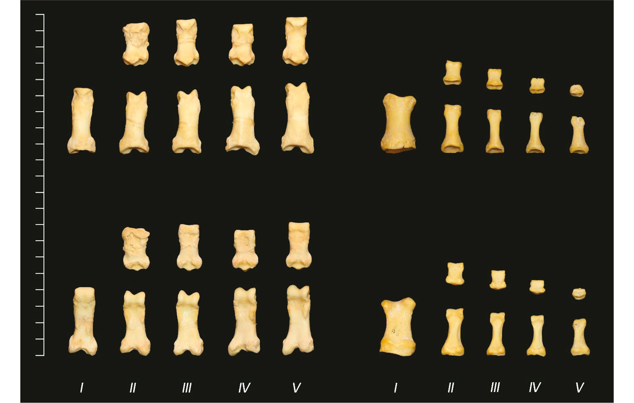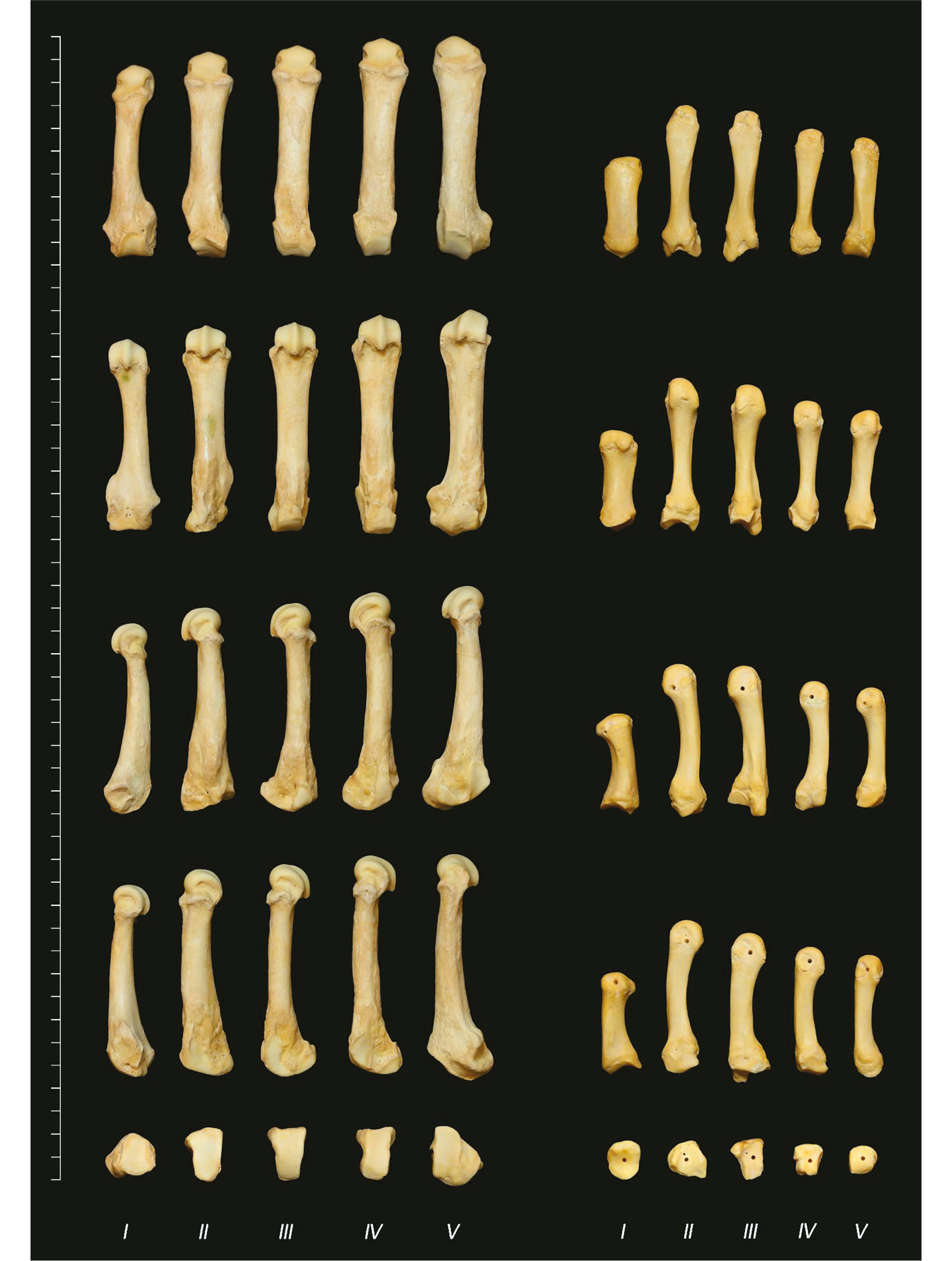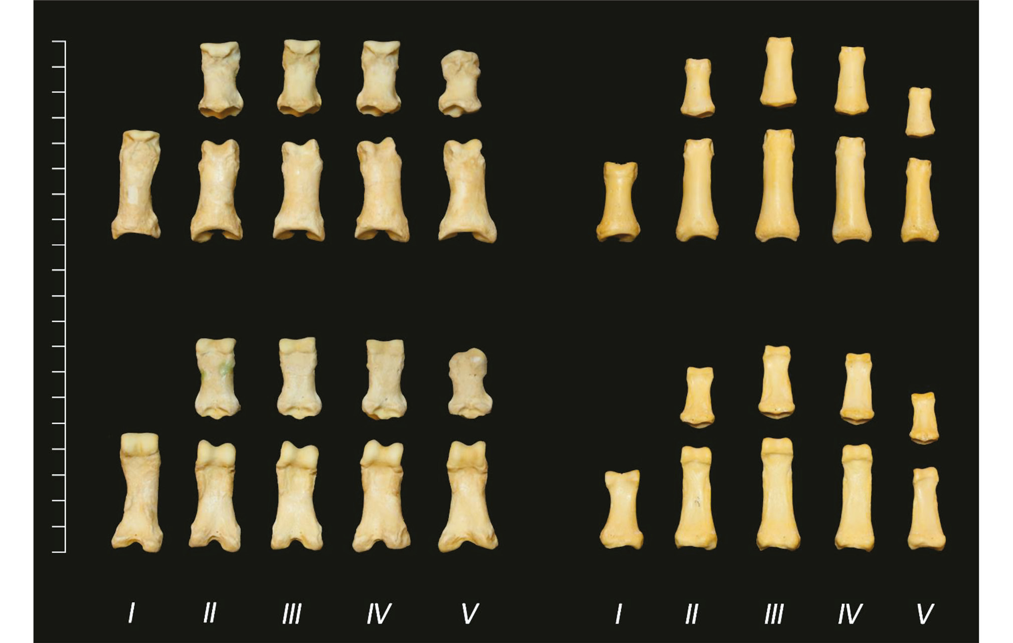 - An increase in the size and massiveness of the metacarpal and metatarsal bones from I to V, which makes the bear’s paw a mirror image of the distal parts of the human limbs. Some studies noted this regularity for the phalanges of the fingers [2]; however, it was not confirmed in our material.