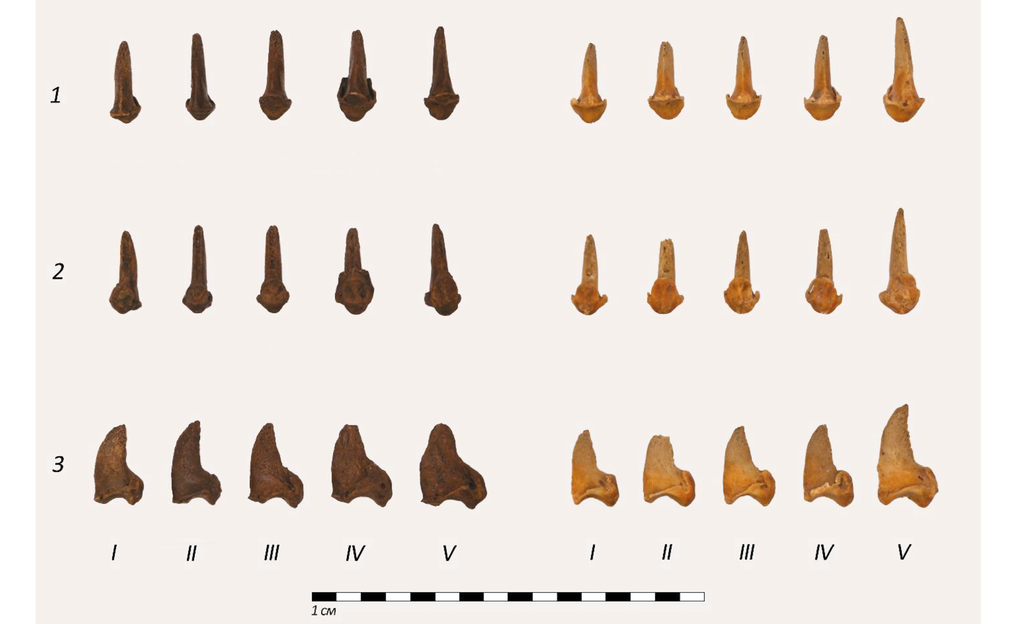 When skinning a carcass, hunters leave the claws on the skin; hence, the phalanges of the fingers were missing from the specimen obtained. The phalanges of a bear from the archaeological collection of the Laboratory of Scientific Methods of the Institute of Archaeology of the Russian Academy of Sciences were used. Bones of the hand and foot of a young male from the collection of the Department of Anthropology, Faculty of Biology, Lomonosov Moscow State University, were utilized as reference material.