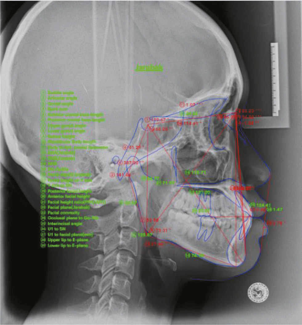 The ANN cephalometric parameters were measured using the end web application, which is a medical record application for orthodontic care. This application is utilized because of its cost-free nature and its capability to reduce errors associated with manual procedures. The visual representation of the measurement obtained using the front-end web application is depicted in Fig. 1.