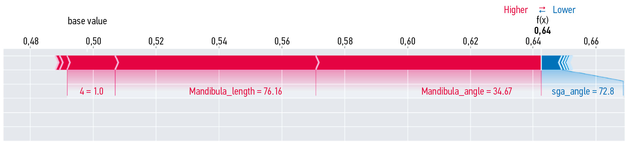In this study, the ANN model utilizes four cephalometric factors as the foundation for gender prediction. However, certain parameters may undermine the accuracy of the prediction. The SHAP model was employed in this work to determine the most relevant parameters in predicting gender. Fig. 4 illustrates that the mandibular angle had the strongest positive impact on gender prediction, whereas the SGA angle had the most negative impact on gender prediction.