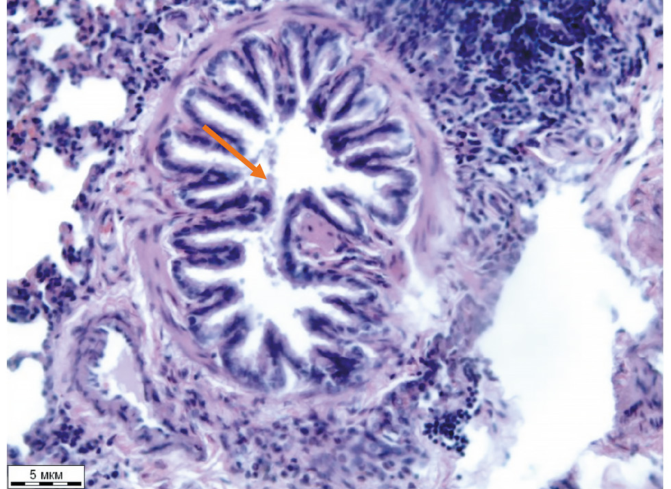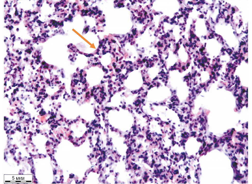 После введения препаратов, измерения функциональных показателей в установленные сроки животных выводили из эксперимента путём смещения шейных позвонков под общим наркозом (хлоралгидрат). Вскрывали грудную полость, лёгкие извлекали и помещали в 10% нейтральный формалин, а затем заключали в парафин. Срезы лёгких толщиной 5 мкм наносили на предметные стёкла, проводили окрашивание гематоксилином и эозином согласно общепринятой методике.