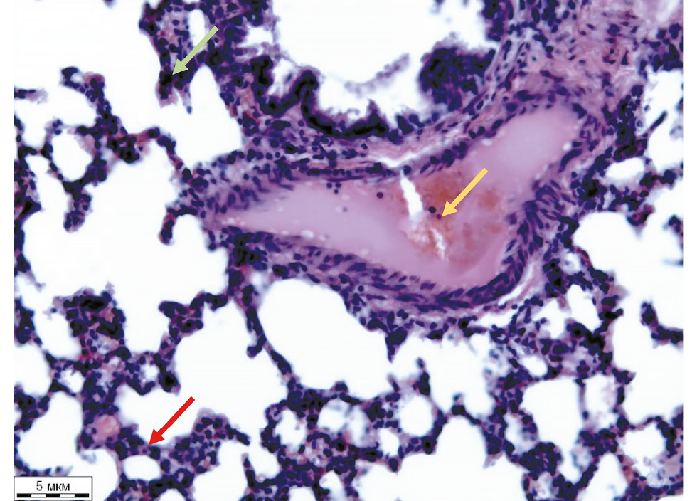 4. Fig. 3. Rat lung (baclofen and ethanol, 4.5 hours): thickening of the interalveolar septa (red arrow), infiltration of the interalveolar septa by segmented leukocytes (green arrow), sludge phenomenon (yellow arrow). Hematoxylin and eosin staining, ×200.