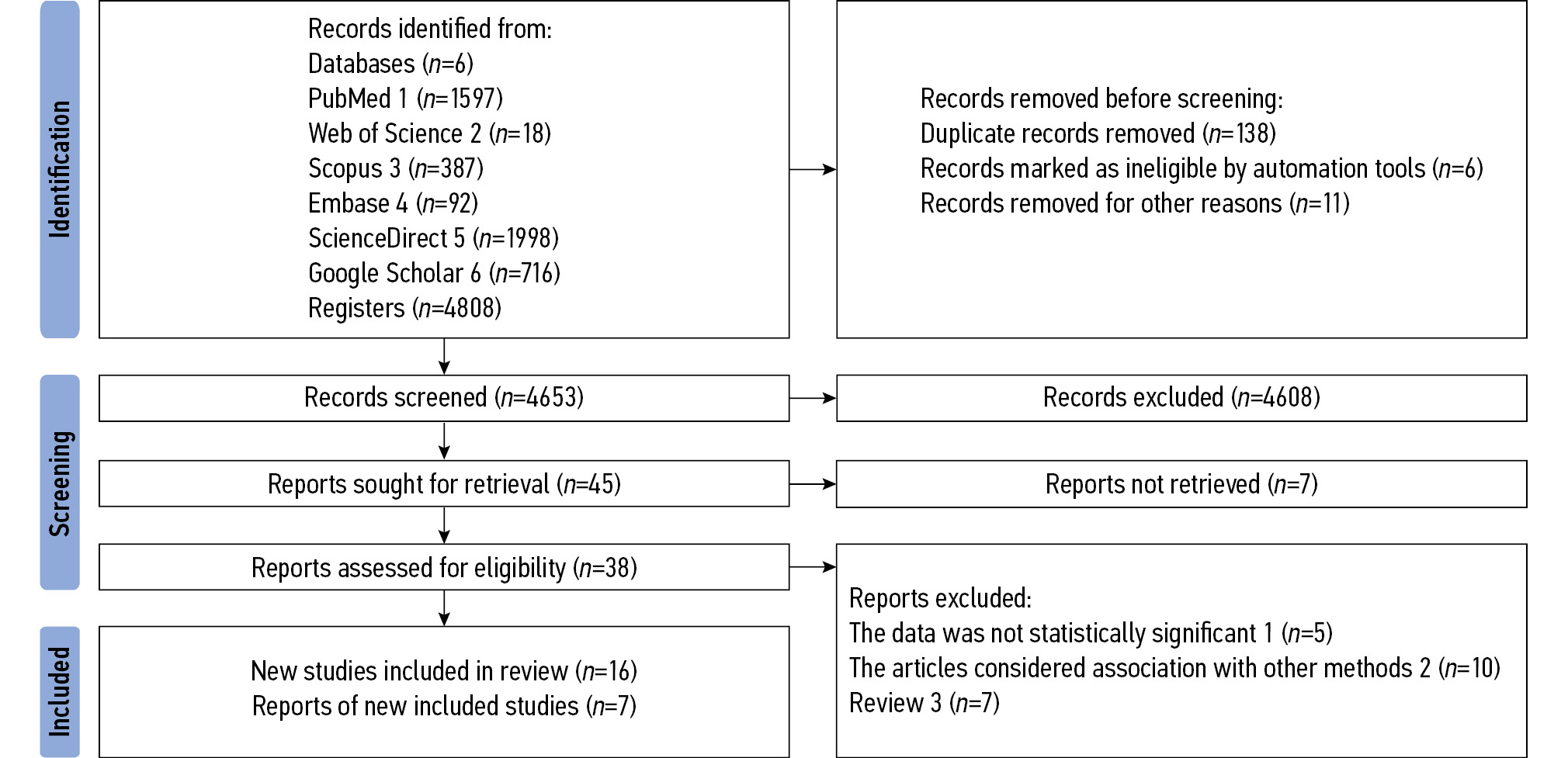 An initial search of six databases PubMed electronic databases yielded 4,808 records, including 18 from Web of Science, 387 from Scopus, 92 from Embase, 1998 from ScienceDirect, and 716 from Google Scholar. One hundred thirty-eight records were removed due to duplicates. From the remaining 45 records, 4,757 irrelevant citations were removed after the title and abstract review. A further 29 ineligible articles were removed after comprehensive evaluation based on inclusion and exclusion criteria. Ultimately, 16 articles [24–39] were included in the qualitative synthesis, and only seven were research. The process is shown in Figure 1.