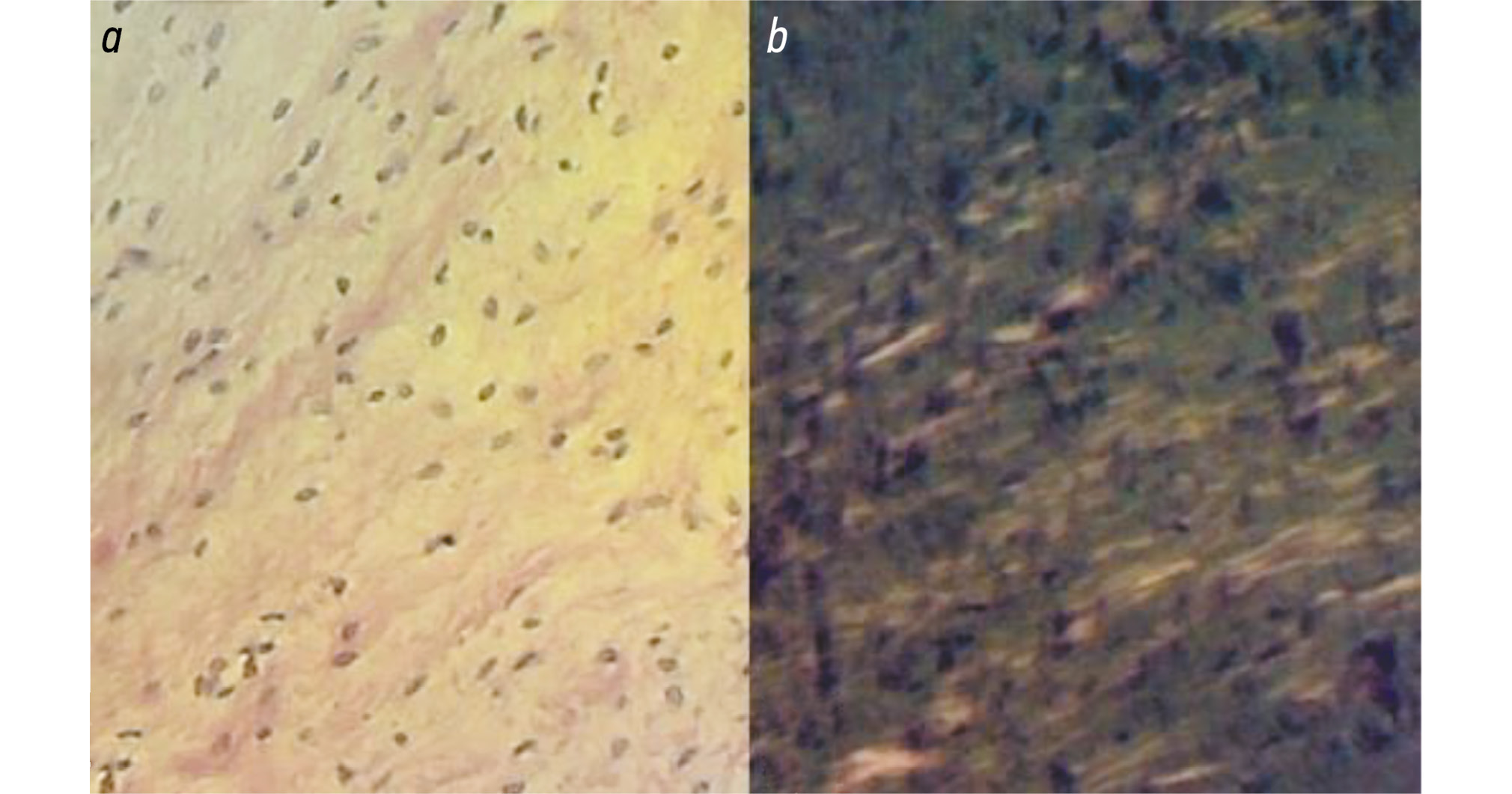 Fig. 1. Dura mater of a deceased newborn with extremely low birth weight, sinus drainage area. Yellow filter. a ― staining: hematoxylin-eosin, magnification, ×400; b ― staining: hematoxylin-eosin, polarization, 10×10. (Photo from personal archive of the authors).