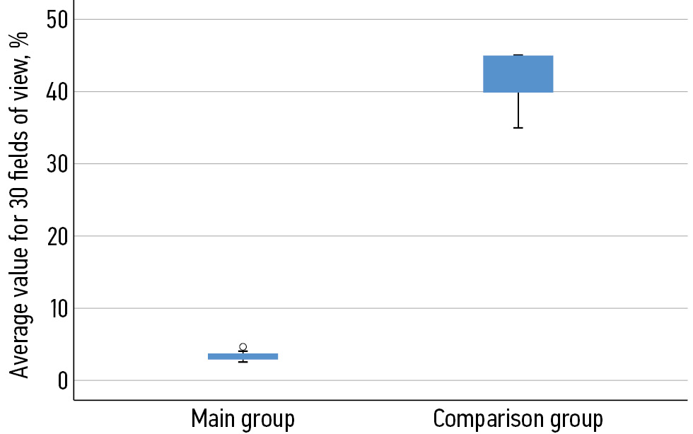 During statistical analysis, the minimum, maximum, and average values of the amount of collagen type I in the main group and comparison groups were compared. The indices were evaluated for compliance with normal distribution using the Kolmogorov–Smirnov test (with significance correction according to Lilliefors) and Shapiro–Wilk test. In both groups, the hypothesis of compliance with normal distribution was rejected. Therefore, structural indices (median and quartiles designated as Me [Q25; Q75]) and minimum and maximum values were used to characterize the indices. The nonparametric Mann–Whitney test was used to compare the groups by the indices of the percentage of mature fibers (Table 1). The minimum value for 30 visual fields varied from 2% to 5% in the main group (median: 2%) and from 30% to 40% in the comparison group (median: 39%). The maximum value for 30 visual fields varied in the main group from 3% to 5% (median: 4.5%) and from 40% to 50% in the comparison group (median 50%). The average value in the main group varied from 2.5% to 4.5% (median: 3.5%) and from 35% to 45% in the main group (median: 40%). A significant difference (p <0.001) was noted in the indices of presence of type I collagen fibers in the main and comparison groups. Figure 3 presents the diagram of the range of the average value of the percentage of mature fibers in the main and comparison groups.