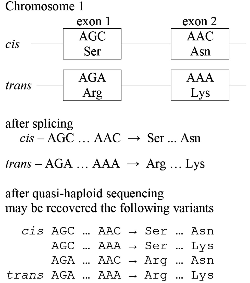 Помимо того что при квазигаплоидном секвенировании теряется половина геномной информации, оно ещё приводит подчас к ложному объединению экзонов из разных парных хромосом с учётом потенциально имеющихся в них в цис- и трансположениях мутаций, в результате чего могут восстанавливаться недостоверные аминокислотные последовательности, способные исказить истинную картину связи генотипа с фенотипом, включая или, точнее, исключая (согласно теме данной статьи) их реальное влияние на внешность человека. На рис. 1 в качестве примера приведено неоднозначное по результатам секвенирования ДНК восстановление некоего белка.