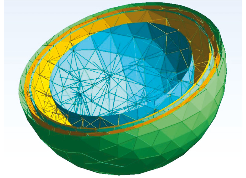 С учётом названных ограничений одной из наиболее перспективных для конечно-элементного моделирования областей тела представляется голова, геометрия мозгового отдела которой очень близка к такому телу, как многослойный шар с равномерным распределением слоёв однородной структуры [8]. Поверхность шара имеет с касательной плоскостью только одну общую точку, что позволяет пренебречь потерями тепла путём теплопроводности при контакте головы с опорной поверхностью и не учитывать в КЭМ теплофизические свойства последней.