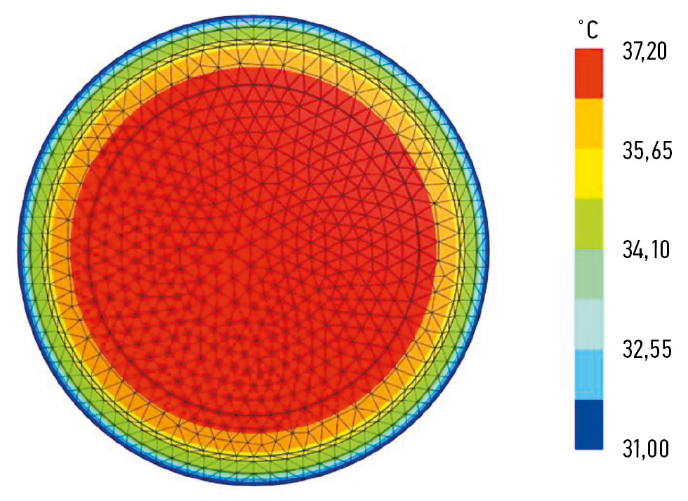 По умолчанию в качестве условий Дирихле задавали усреднённые прижизненные температуры на внешних границах слоёв (см. табл. 1). Затем, используя слабую формулировку уравнения Лапласа, выводили матричное уравнение [11, 12], из которого находили начальную температуру в каждой точке КЭМ (рис. 2).