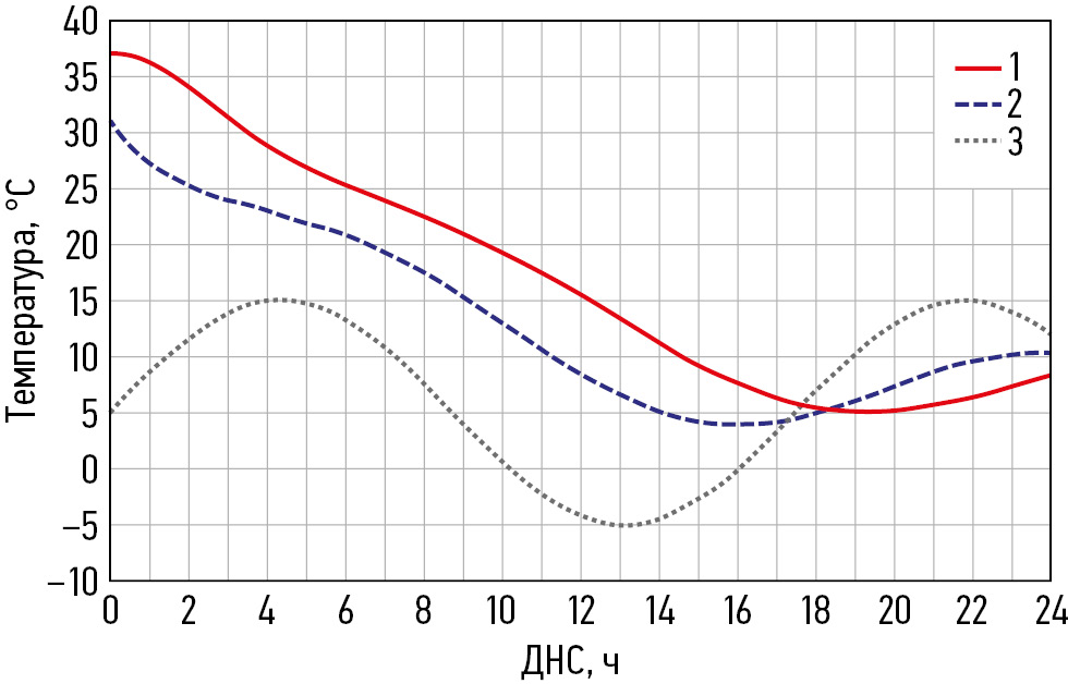 Fig. 3. Graphs of cooling of the center and surface of the finite element model with sinusoidal changes in external temperature. Symbols: 1 ― temperature at a point with zero radial coordinate; 2 ― temperature at points on the surface of the finite element model; 3 ― ambient temperature. ДНС ― postmortem interval.