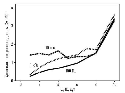 Fig. 1. Changes in the specific electrical conductivity of synovial fluid of the knee joints of a human corpse over 10 days at three current frequencies; 100 Hz, 1 and 10 kHz. TSD, time since death.