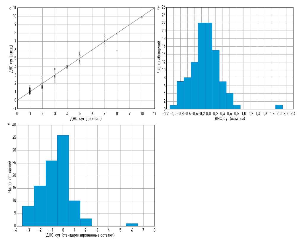 Fig. 4. The relationship between the target and output values of the time since death (a) based on model No. 2 with the architecture of a multilayer perceptron 2-5-1, residuals (b), standardized residuals (c). TSD, time since death.