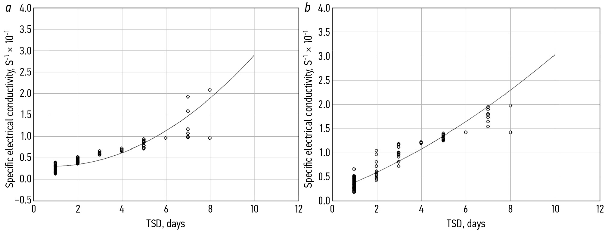 To visualize trends in the changes of synovial fluid specific electrical conductivity relative to the duration of the postmortem interval, constructing trend lines is the most appropriate approach. This provides an additional means of expressing the observed changes as mathematical equations. The analysis demonstrated that these changes are most accurately represented by equations based on second-degree polynomial relationships between the studied parameters (Fig. 2).