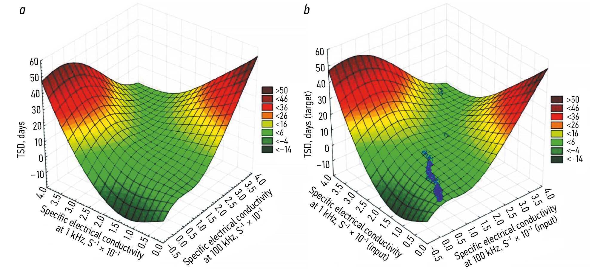 Fig. 5. Surface diagrams of the original data (a) and the data obtained using model No. 2 with the architecture of a multilayer perceptron 2-5-1 (b). TSD, time since death.