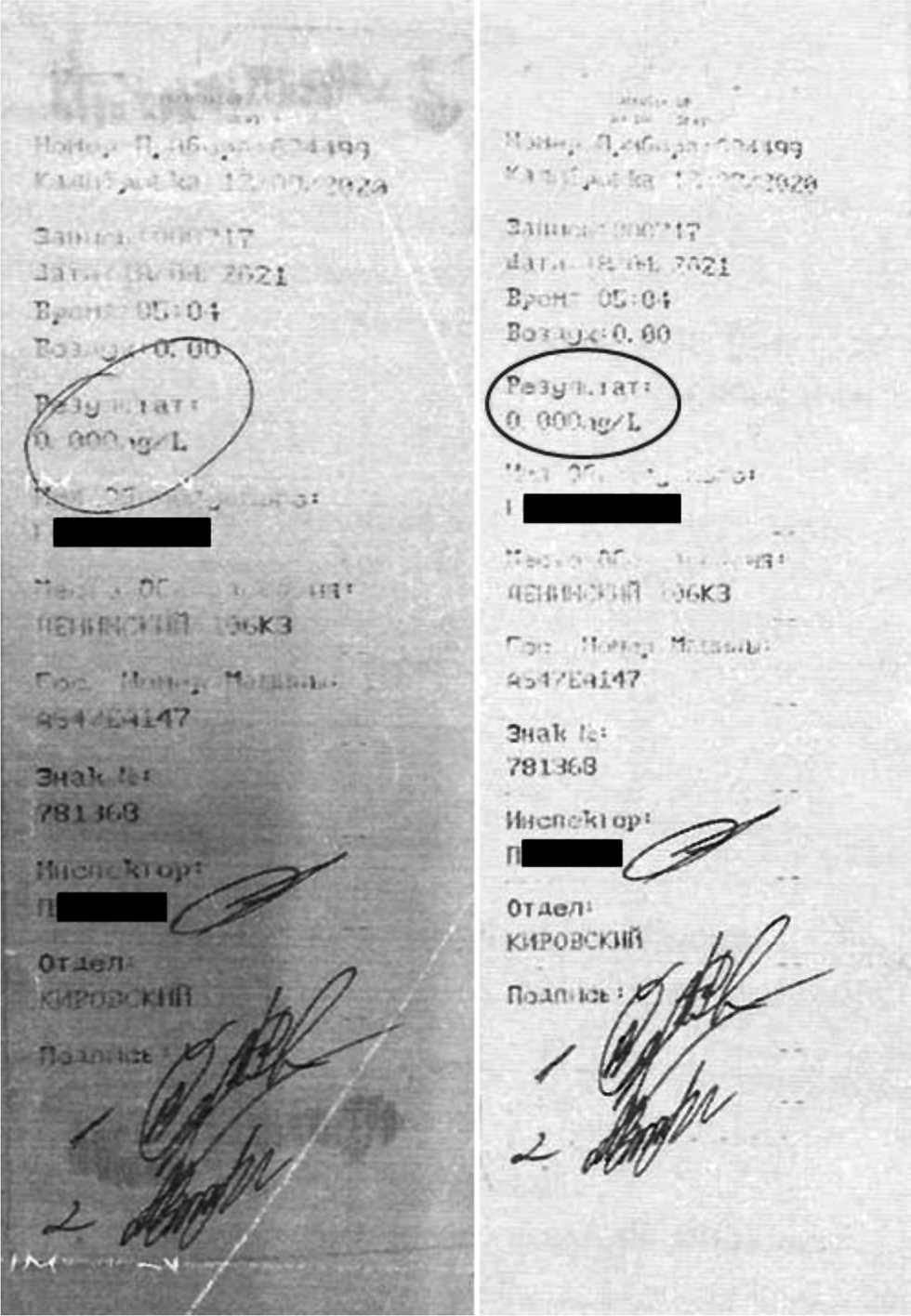 Также при освидетельствовании в акте зафиксировали: «…проведено в 05 ч 04 мин с применением технического средства измерения «Алкотектор PRO-100 combi®» (Shenzhen Well Electric Co., Ltd., Китай), заводской номер прибора 634499, дата последней поверки прибора 12 сентября 2020 г., пределы допускаемой абсолютной погрешности ±0,048 мг/л. Показания прибора 0,000 мг/л. Результат освидетельствования: алкогольное опьянение не установлено…». В дальнейшем специалист в области судебной медицины и токсикологии имел возможность ознакомиться со всеми материалами, включая оригиналы распечаток прибора, согласно которым на момент 05:04 18.04.2021 зафиксирован нулевой результат его показаний (рис. 1).