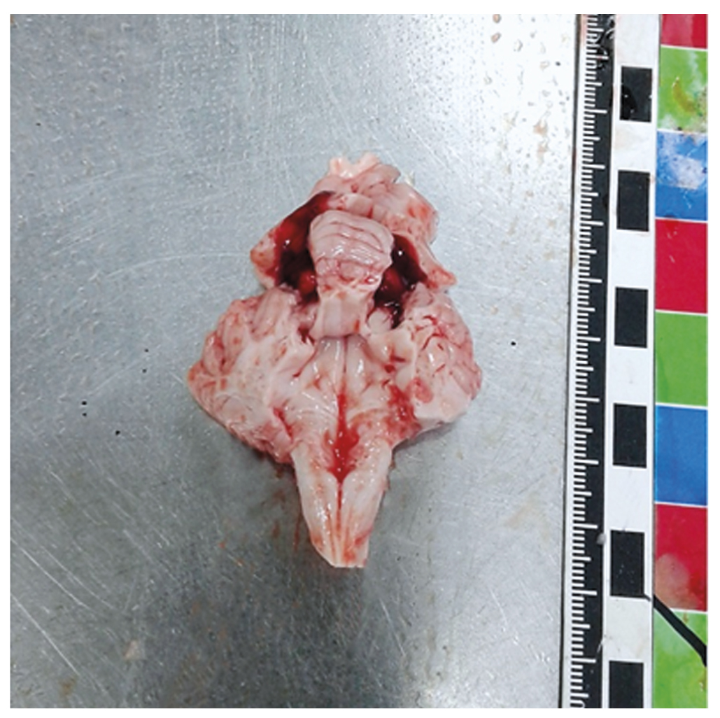 Вскрытия детей проводили в соответствии с медицинскими технологиями, применяемыми при производстве судебно-медицинских экспертиз [8]. Детальному макроскопическому изучению был подвергнут ствол мозга с учетом особенностей анатомического строения продолговатого мозга и локализации ядер черепно-мозговых нервов в дне ромбовидной ямки (рис. 1–4). При гистологическом исследовании кусочки внутренних органов и головного мозга подвергали стандартной парафиновой обработке, окрашивали гематоксилин-эозином и пикрофуксином по Ван Гизону в 100% случаев. Кусочки стволовых отделов мозга были дополнительно окрашены гистохимическими методами: по Вейгерту — на эластические волокна, по Шпильмейеру — на миелиновые волокна, толуидиновым синим по Нисслю — для изучения структуры нервной ткани. Общий объем изученных гистологических препаратов составил 12 321 срезов, которые изучали при помощи светового микроскопа «Olympus-CX 31» с микрофотографированием. Микроморфометрия производилась с использованием программного обеспечения Image J2x, что позволило определить площадь объекта, выделенного на фотографии гистологического препарата. При изучении микроскопических срезов продолговатого мозга в основной группе (СВСД) и группе контроля провели статистический анализ морфометрических измерений с помощью пакета статистических и прикладных программ Statistica 6.0 (США).