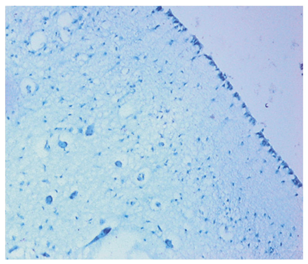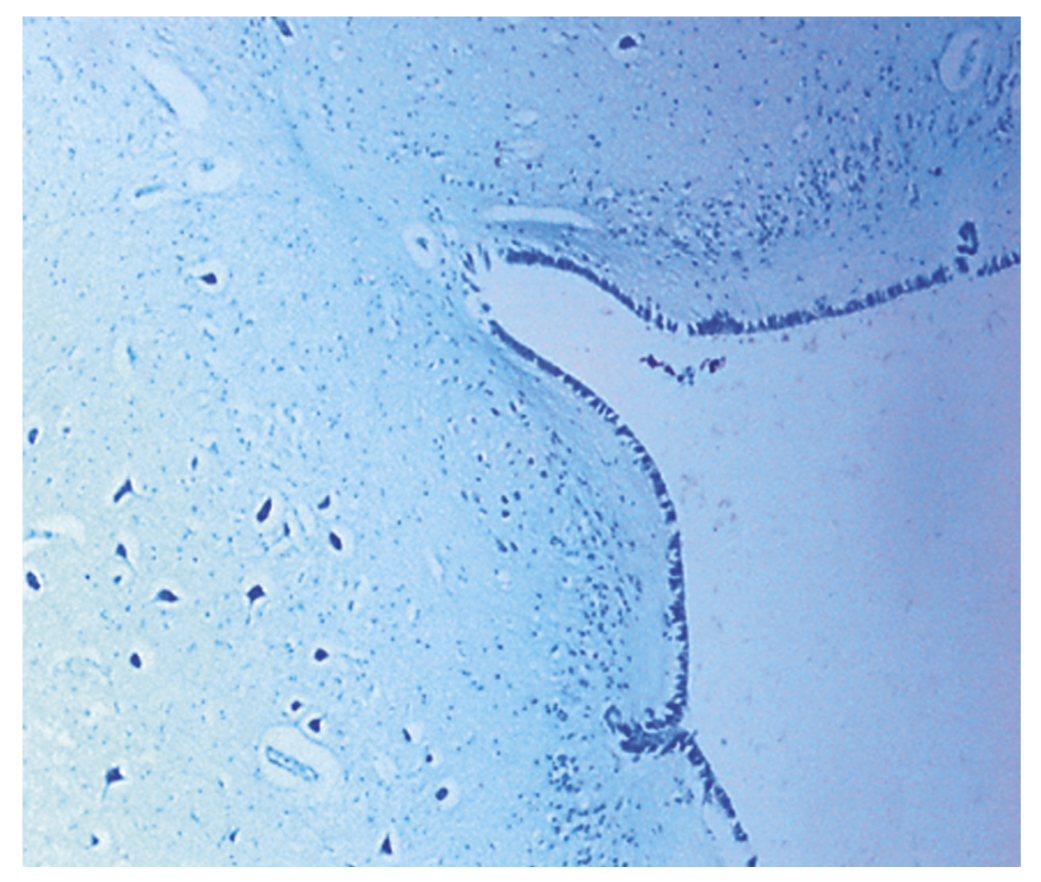 Рис. 3. Срединная борозда продолговатого мозга в микропрепарате (мальчик, 3 месяца 12 дней). Окраска толуидиновым синим по Нисслю. Ув. 40