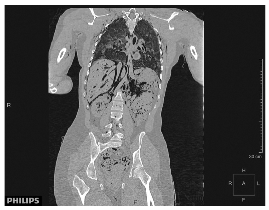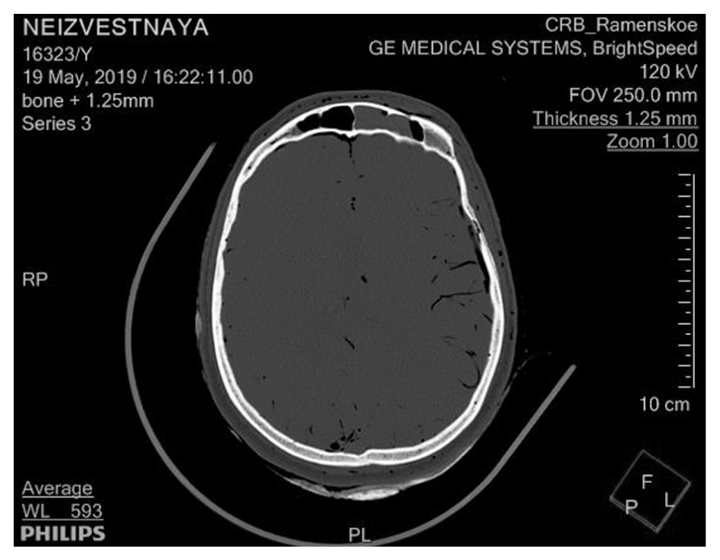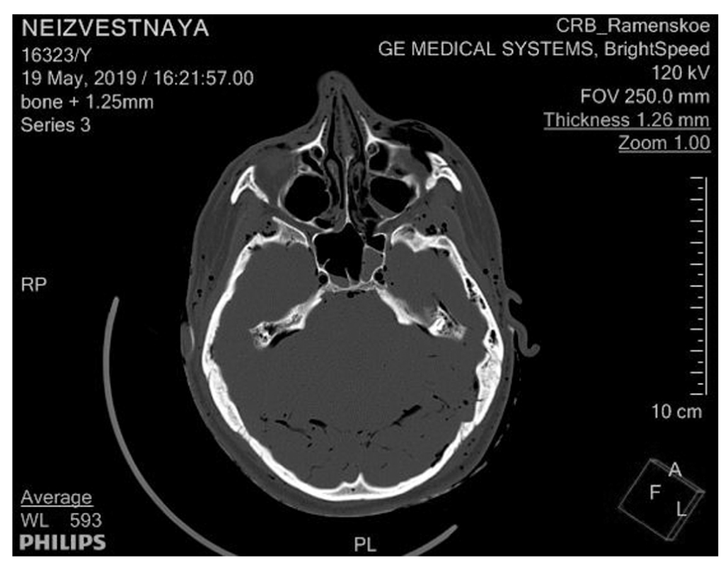 Компьютерное томографическое исследование было проведено в день обнаружения трупа. Труп был доставлен в герметичном плотном полиэтиленовом мешке в положении на спине с вытянутыми вдоль туловища руками и выпрямленными ногами. Нативное (без применения контрастных веществ) КТ-исследование всего тела от свода черепа до пальцев стоп проводилось на мультиспиральном компьютерном томографе Optima фирмы General Electric (64-срезовый томограф с толщиной срезов 1,5 и 2 мм).
