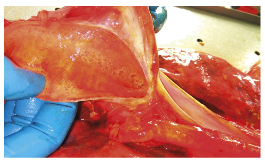При внутреннем исследовании трупа установлено: в просвете трахеи, главных и долевых бронхов стойкая мелкопузырчатая серовато-розовая пена (рис. 6).