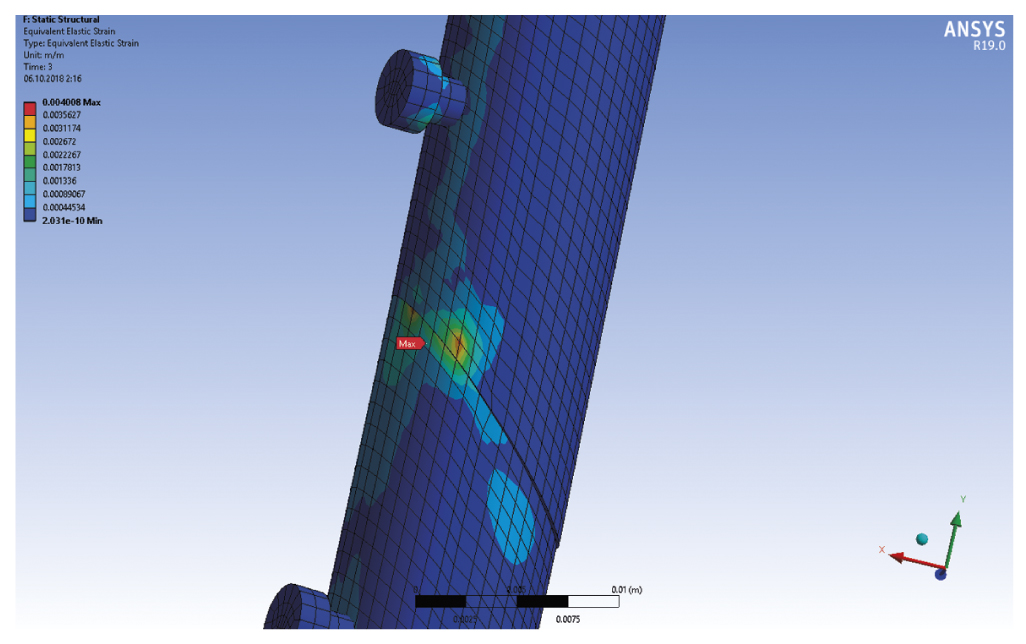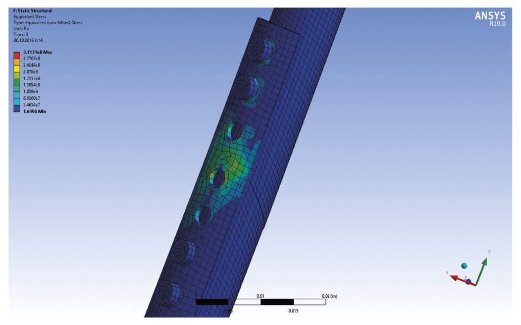 В ходе экспериментального исследования создавалось только одно условие взаимодействия — на малоберцовую кость, имеющую косой перелом диафиза в нижней трети, который зафиксирован титановой пластиной с четырьмя шурупами, закрепленную в верхней трети, действует давление под углом 45 градусов к оси малоберцовой кости с приложением на нижнюю треть кости. Созданная модель кости в верхней части закреплена связями с ограничением перемещений по осям х, у, z, которое моделирует неподвижную опорную ногу.
