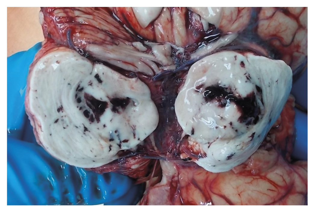 В мягких тканях волосистой и лицевой части головы также были обнаружены кровоизлияния без размозжения тканей. При исследовании головного мозга была выявлена солитарная внутримозговая гематома в области центральной части хвостатого ядра правого полушария головного мозга размером около 0,5×1,0 см и обширное пропитывающее прерывистое блестящее темно-красное кровоизлияние в толще центральной части варолиева моста на участке около 1,5×1,3×1,5 см (рис. 1).