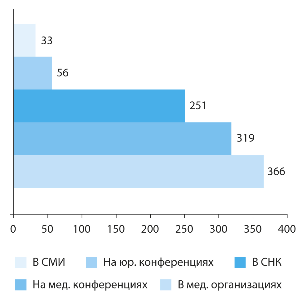 Так, с апреля 2018 г. образовательным проектом кафедры судебной медицины Казанского ГМУ «Клиника медицинского права» проведено восемь образовательных мероприятий в виде клинико-правовых разборов уголовных дел по специальностям «детские инфекции» (2), «акушерство и гинекология» (2), «общая хирургия» (2), «детская хирургия» и «педиатрия» (2), участниками которых стали 590 человек. Необходимо отметить, что на данном этапе проект не является образовательным курсом и не входит в основную профессиональную образовательную программу вуза, что делает участие в мероприятиях исключительно добровольным и отражает личный интерес и мотивацию обучающихся. Среди участников были представлены студенты, ординаторы и аспиранты Казанского ГМУ, Казанской государственной медицинской академии, Института фундаментальной медицины и биологии Казанского федерального университета и обучающиеся юридического факультета Казанского (Приволжского) федерального университета. При проведении данных мероприятий были задействованы 20 преподавателей с 11 кафедр вышеуказанных вузов, из них шесть профессоров, семь доцентов, три заслуженных врача Республики Татарстан, один заслуженный врач Российской Федерации, один член-корреспондент РАЕН, а также четыре практикующих юриста, три из которых являются действующими членами коллегии адвокатов Республики Татарстан. Проект был активно поддержан Министерством здравоохранения Республики Татарстан, в качестве экспертов также выступили три главных специалиста Минздрава РТ и главный специалист Управления здравоохранением г. Казани, которые подробно разобрали с обучающимися дефекты в тактике ведения пациентов, продемонстрировали процессуальные тонкости установки прямой причинно-следственной связи между данными дефектами и неблагоприятным исходом и единогласно отметили наглядность нового образовательного формата.