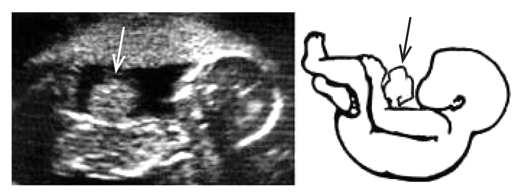 Рис. 2. Антенатальное ультразвуковое исследование плода с гастрошизисом и визуализационная схема порока (стрелкой обозначен экстраперитонеально расположенный кишечник)