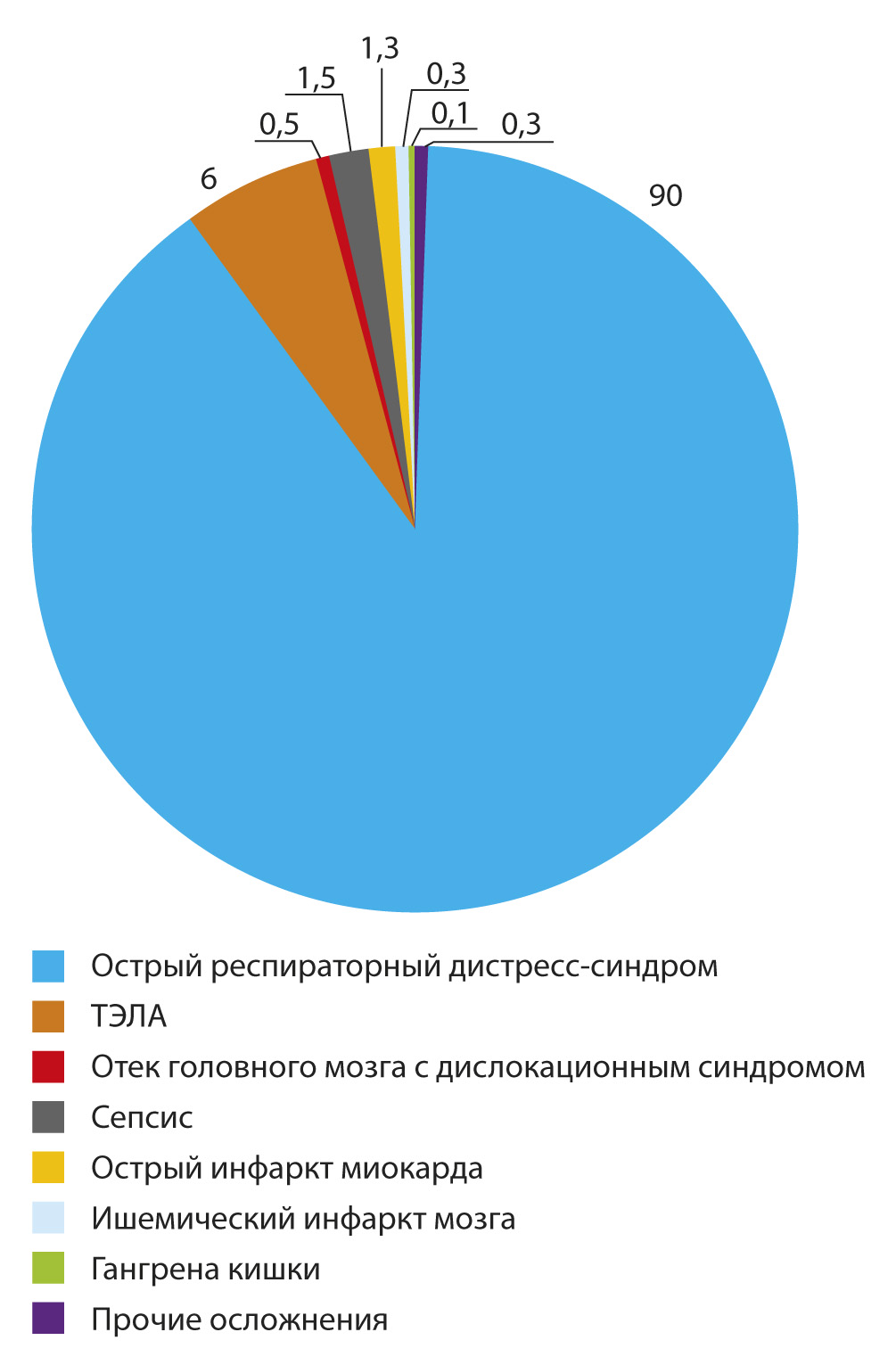 Результаты анализа выявили, что среди смертельных осложнений значительно преобладал острый респираторный дистресс-синдром (90%), на втором месте (6%) оказалась тромбоэмболия лёгочной артерии (рис. 1).