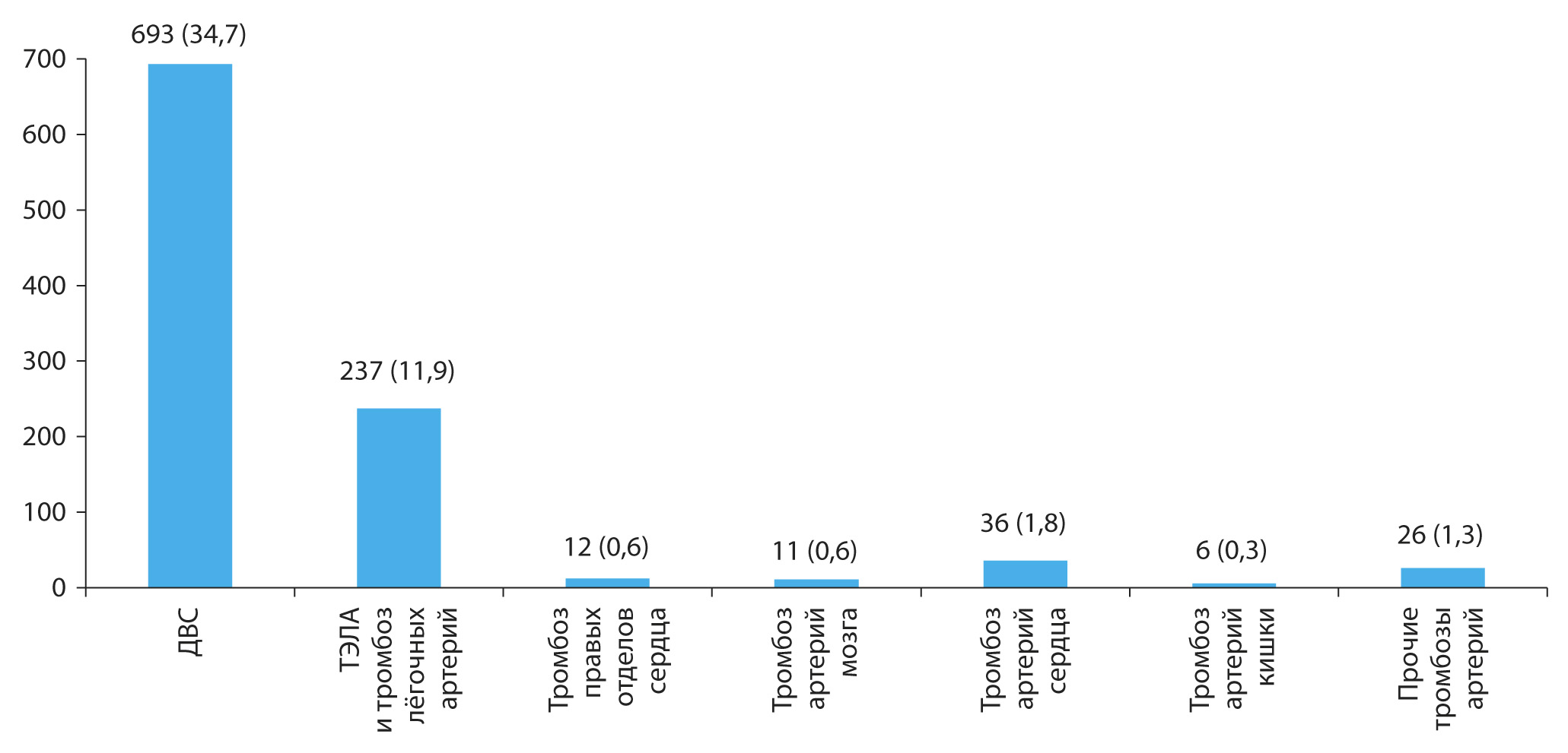 Рис. 2. Частота (абс. цифры и %) тромботических и тромбоэмболических осложнений у умерших от COVID-19 (n=2000) Примечание. Тромбоз коронарных артерий сердца, артерий головного мозга и других органов наблюдался независимо от наличия и тя- жести атеросклероза; тромбоэмболия лёгочной артерии (ТЭЛА) и тромбоз лёгочных артерий представлены вместе в связи с воз- можной ошибкой дифференциальной морфологической диагностики [18]. ДВС — диссеминированное внутрисосудистое свёртывание.