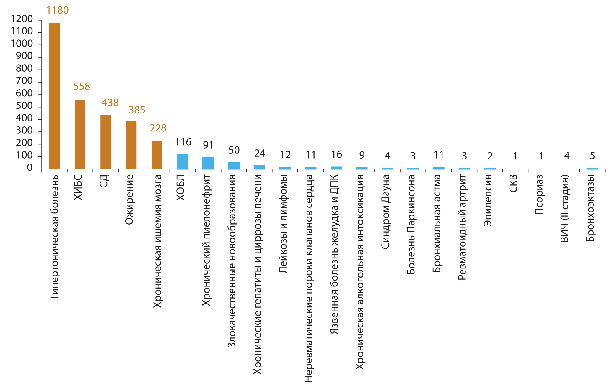 Рис. 3. Коморбидные заболевания (абс. число) у умерших от COVID-19 (n=2000) Примечание. Сахарный диабет (СД) представлен 5 наблюдениями заболевания 1-го типа и 433 — 2-го типа [18]. ХИБС — хроническая ишемическая болезнь сердца, ХОБЛ — хроническая обструктивная болезнь лёгких, ДПК — двенадцатиперстная кишка, СКВ — систем- ная красная волчанка, ВИЧ — инфекция, вызванная вирусом иммунодефицита человека.