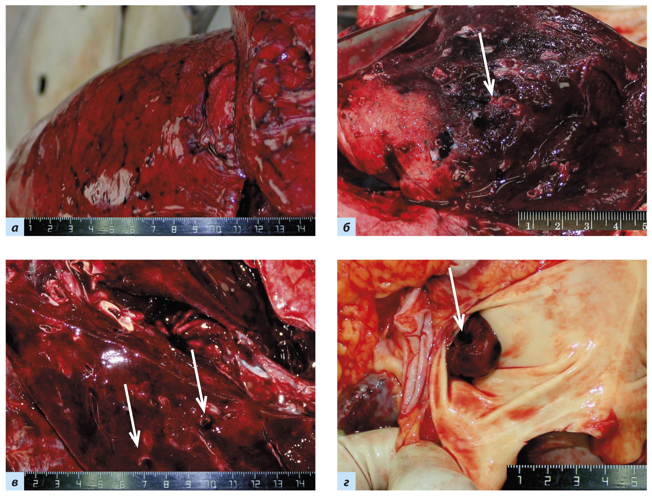 Рис. 4. Диффузное альвеолярное повреждение, экссудативная стадия: a — ткань лёгких диффузно уплотнена и практически безвоз- душна, на поверхности красного цвета, характерного «лакового» вида, с кровоизлияниями под плеврой; б, в — на разрезе красного и тёмно-вишнёвого цвета, с участками ателектазов, сливными кровоизлияниями и геморрагическими инфарктами; множественные пристеночные и обтурирующие тромбы ветвей лёгочных артерий и вен разного калибра (стрелки); г — тромбоэмбол в лёгочной артерии (стрелка)