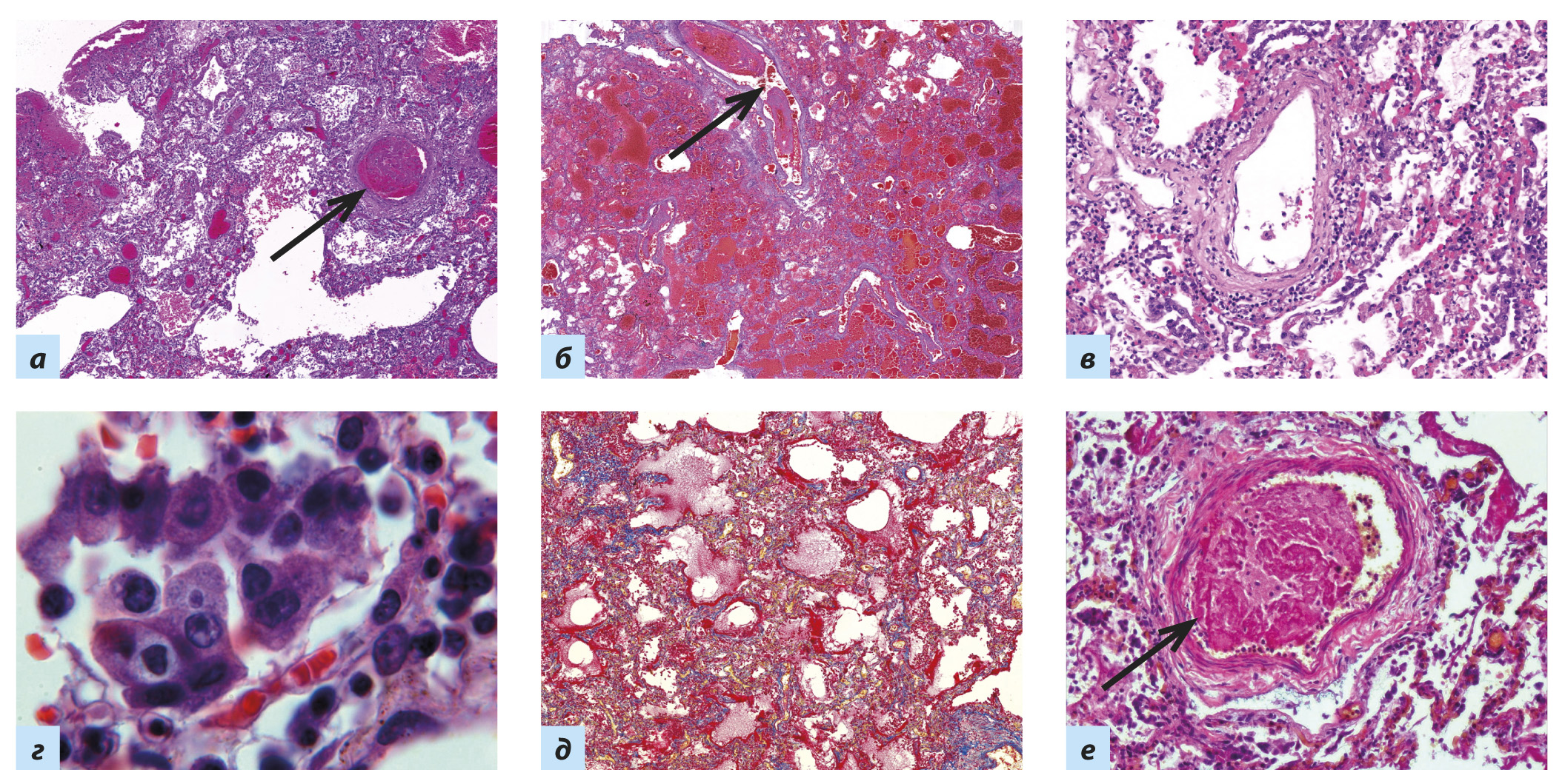 Рис. 5. Диффузное альвеолярное повреждение, экссудативная стадия: a, б — интраальвеолярный отёк с примесью эритроцитов, мо- нонуклеарных лейкоцитов и нейтрофилов, фибрина; кровоизлияния (альвеолярно-геморрагический синдром), гиалиновые мембраны, выраженное полнокровие сосудов со сладжами эритроцитов и тромбами (стрелки); в — мононуклеарная с примесью нейтрофилов инфильтрация межальвеолярных перегородок, периваскулярной ткани, стенок сосудов с альтерацией эндотелия; г — вирусассоци- ированный цитопатический эффект: десквамированные в просвет альвеолы, крупные, уродливой формы альвеолоциты II типа и их симпласты с внутриплазматическими включениями; д — гиалиновые мембраны по контуру альвеол и респираторных бронхиол (красного цвета); е — фибриновый тромб (стрелка) в просвете сосуда с признаками эндотелиита Примечание. Окраска гематоксилином и эозином (a–г, е), MSB по Лёндруму (д); a, б, е — ×60, д — ×120, в — ×250, г — ×1000.
