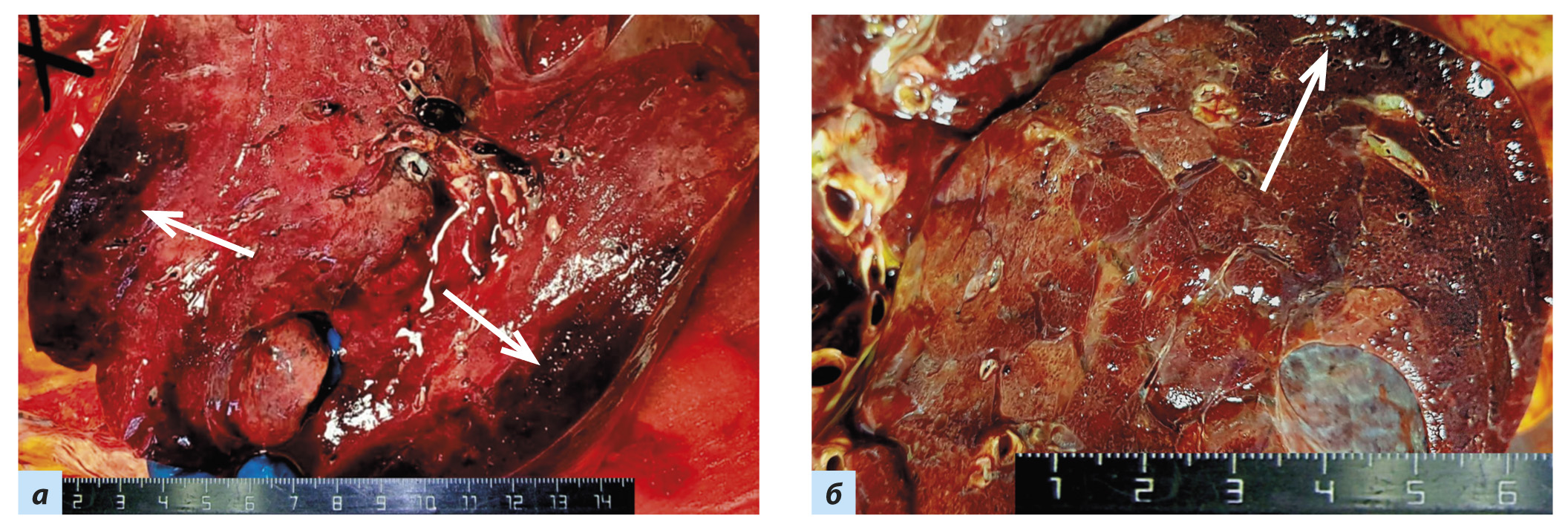 Рис. 6. Диффузное альвеолярное повреждение, пролиферативная стадия: a, б — ткань лёгких уплотнена, безвоздушная, серого и красно- коричневого цвета, с сетчатым рисунком серого цвета и субплевральными геморрагическими инфарктами (стрелки)