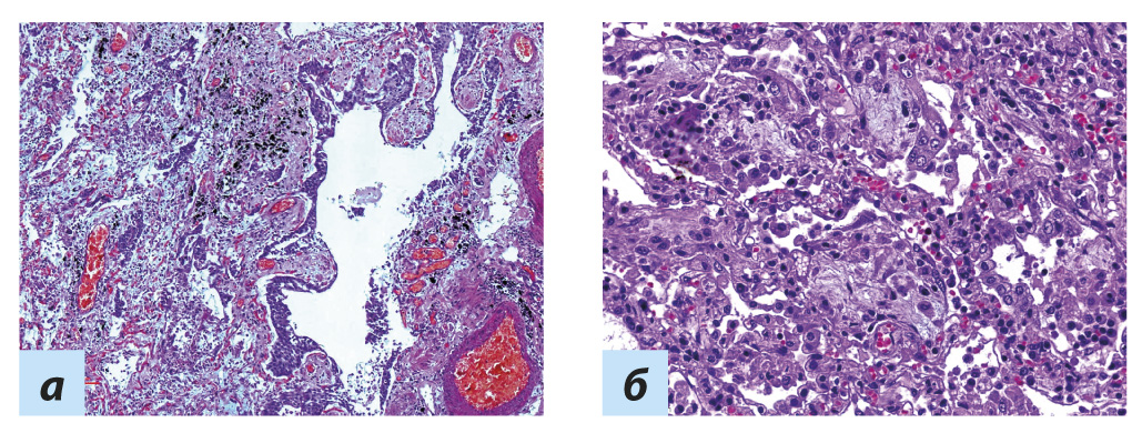 Рис. 7. Диффузное альвеолярное повреждение, пролиферативная стадия: а — плоскоклеточная метаплазия; a, б — грануляцион- ная ткань, фибрин и эритроциты в просвете альвеол Примечание. Окраска гематоксилином и эозином, а — ×60, б — ×250.