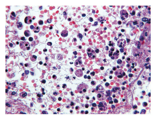Рис. 8. Диффузное альвеолярное повреждение, пролиферативная стадия: феномен цитофагии при синдромеиактивации макрофагов (вторичный лимфогистиоци тоз) Примечание. Окраска гематоксилином и эозином, ×400.