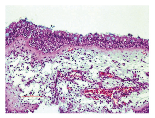 Рис. 9. Слизистая оболочка носа (верхний носовой ход): отёк, полнокровие сосудов микроциркуляторного русла, диффузная лимфоидная инфильтрация, дистрофические и пролиферативные изменения эпителия с интраэпителиальной лимфоцитарной инфильтрацией, отёк базальной мембраны Примечание. Окраска гематоксилином и эозином, ×250.