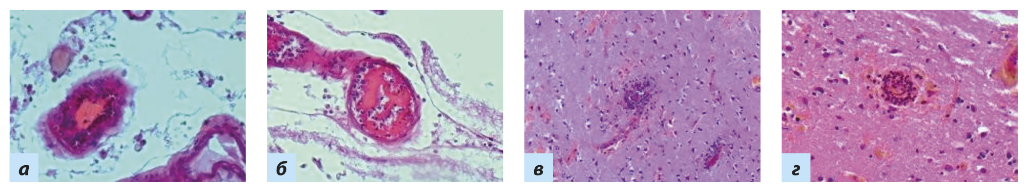 Рис. 10. Мягкие мозговые оболочки (a, б) и головной мозг (в, г): a, б — тромбоваскулит мягких мозговых оболочек; в, г — тромбоваскулит тканей головного мозга Примечание. Окраска гематоксилином и эозином: a, б — ×250, в — ×60, г — ×120.